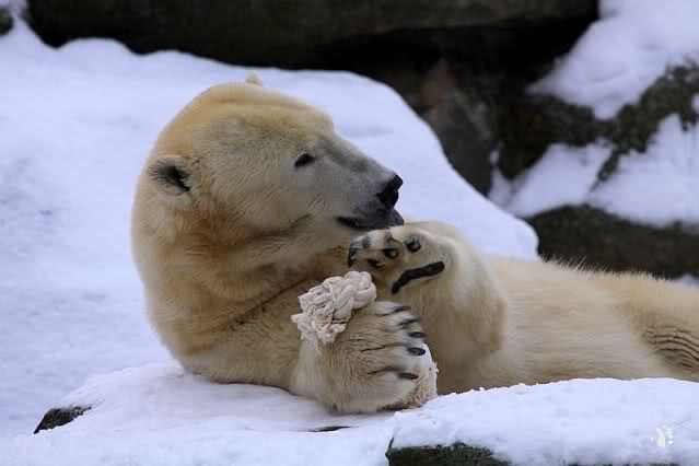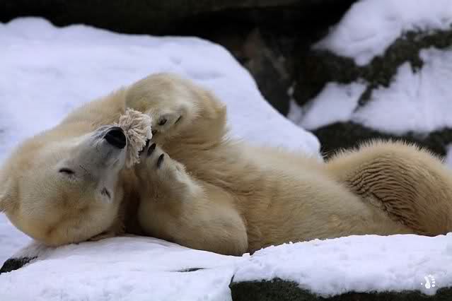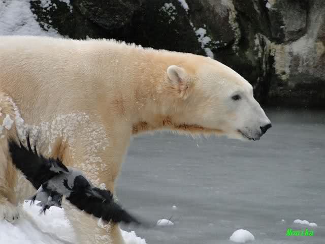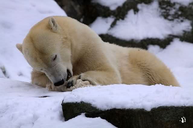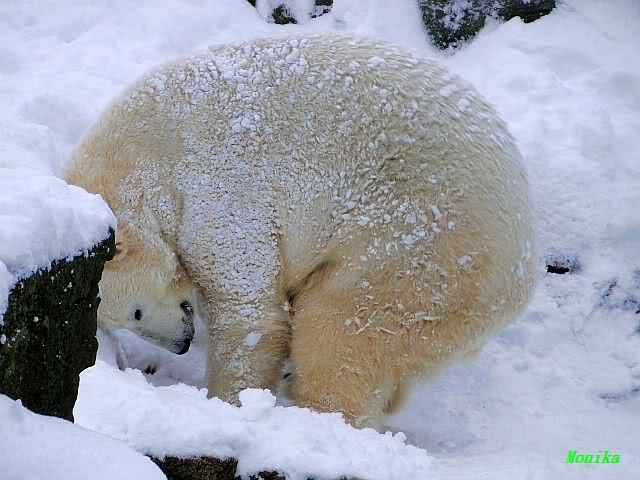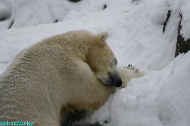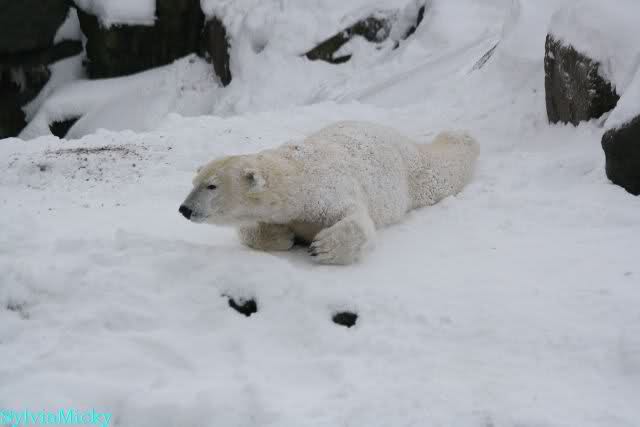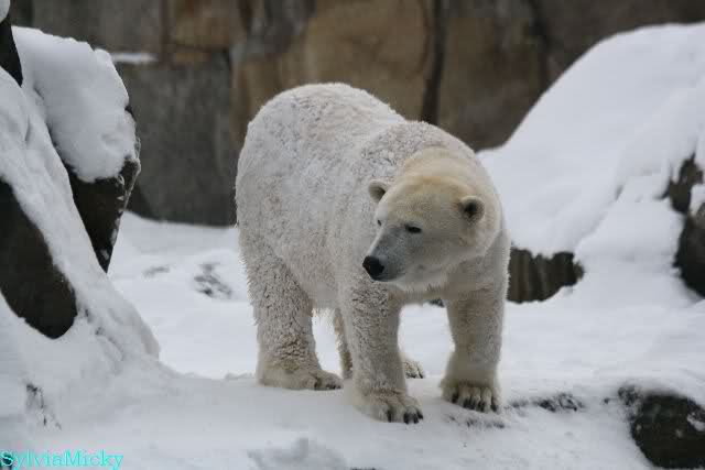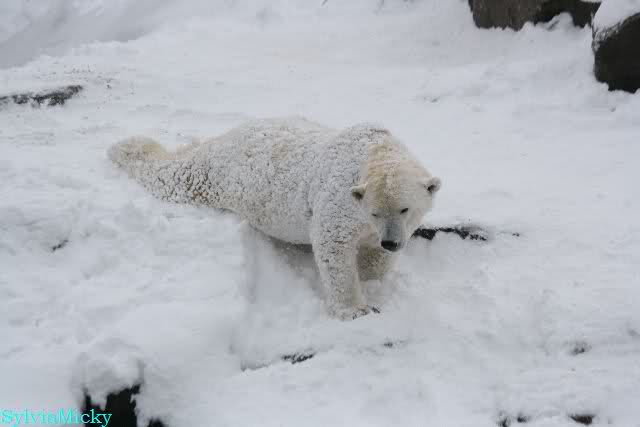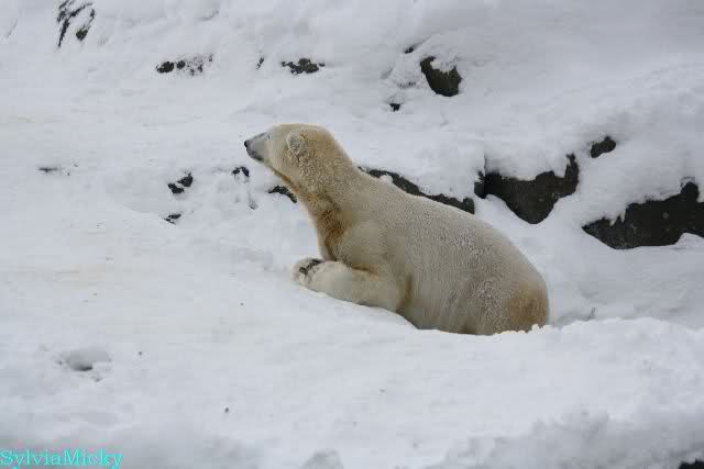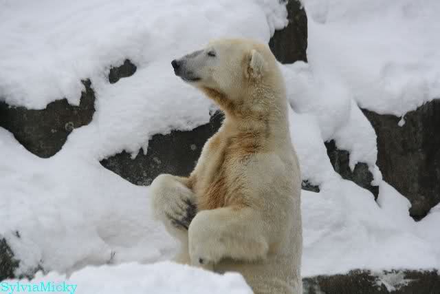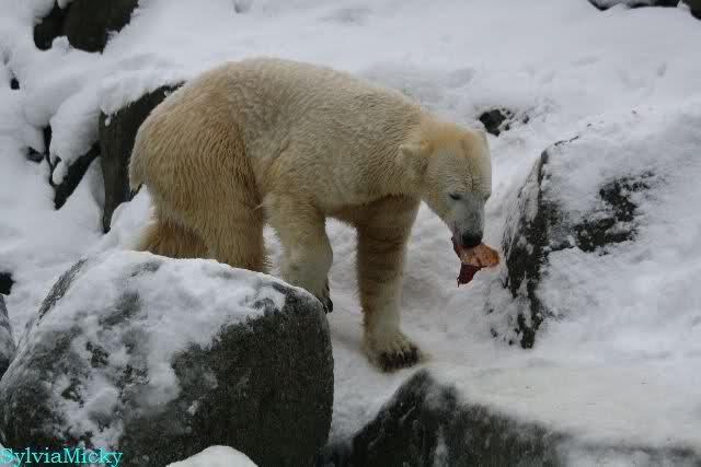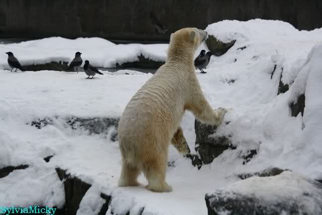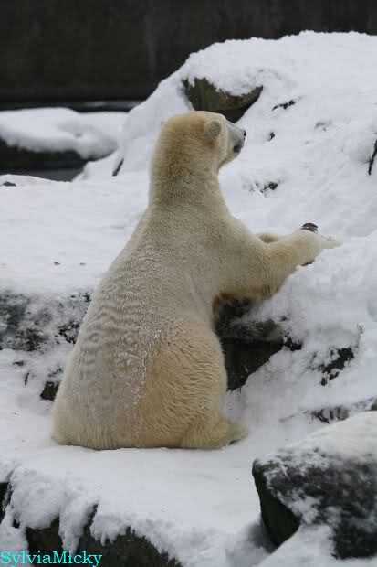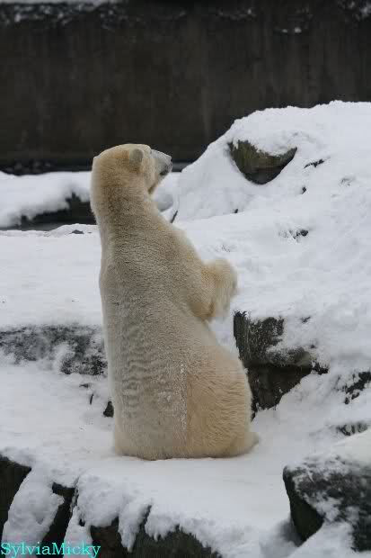 Dann kam eine weitere große Leidenszeit in seinem jungen Leben: Der Umzug auf den großen Eisbärenfelsen. Ich gebe zu, es gab Momente da ertrug ich den Anblick des leidenden Bären nur sehr schwer. Und er hat gelitten. Plötzlich ohne Beschäftigungsmaterial zu sein, sich drei großen Eisbärinnen gegenüber zu sehen, die es ihm nicht leicht machten. Auf nacktem Felsen den Tag zu verbringen, kein Baum, kein Sand, kaum Grünzeug... Aber ihm blieben seine Pfleger, die vertrauten Gerüche, das Umfeld, seine treuen Fans...