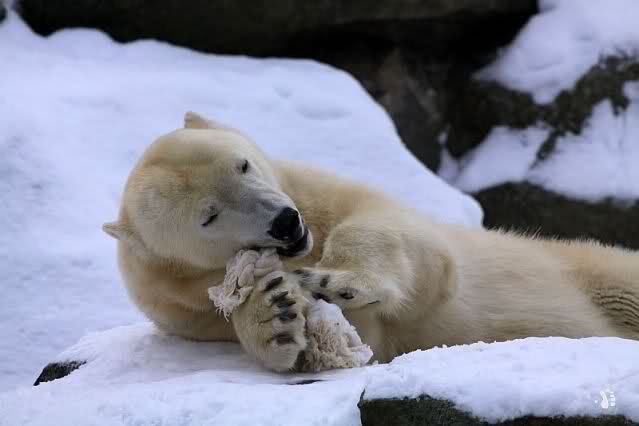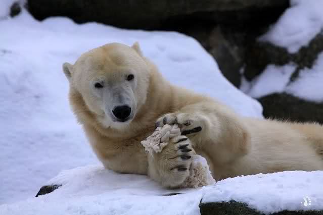 Was mir Anfang Dezember sehr aufgefallen ist, ist wie oft Knut den Besucher anschaute. Wenn ich meine Bilder aber genauer ansag, merkte ich das es oft nur scheint, das er den Besucher anschaut - seine Augen wandern sehr schnell von Besucher nach Felsen nach Essen nach Aste nach Bärinnen nach ... undsoweiter!