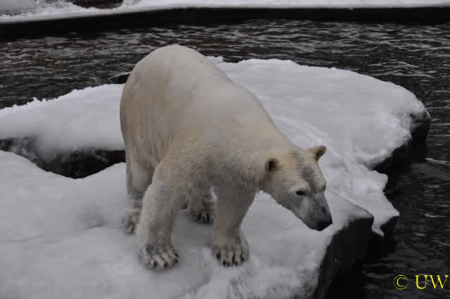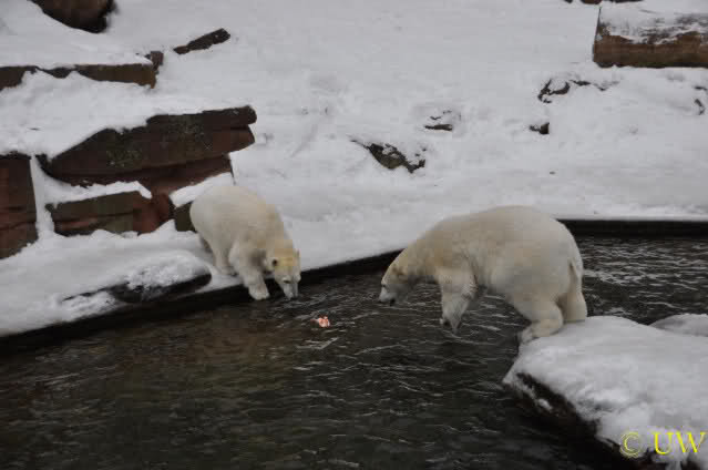 Flocke überlegt, ob sie ins Wasser soll, um den Leckerbissen heraus zu holen