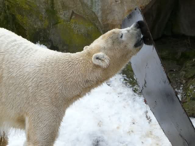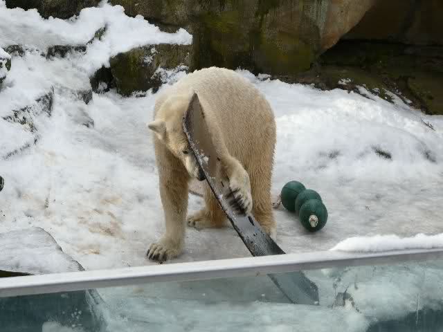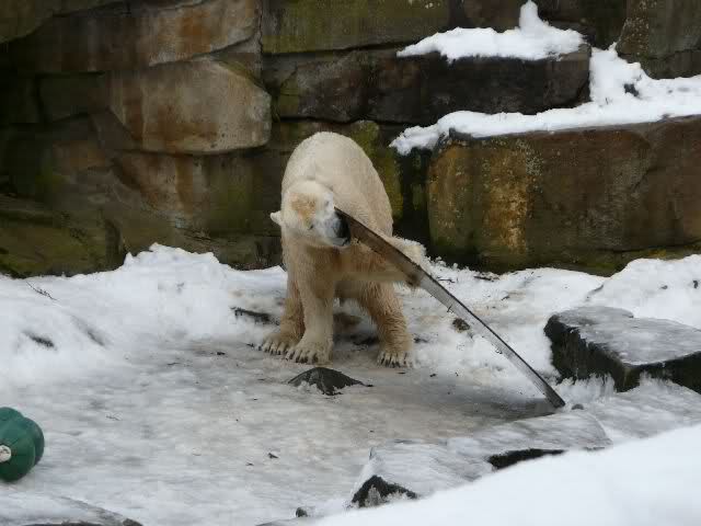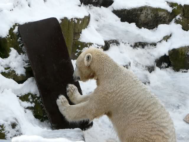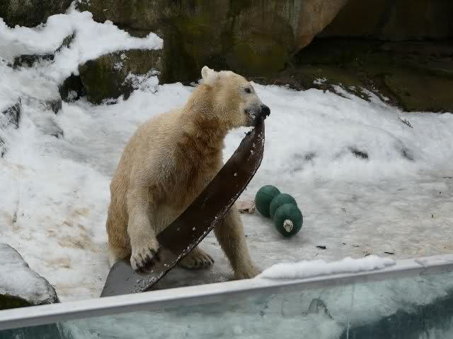 Als wir vor dem Gehege standen, ließ Knut es krachen. Er hatte das Surf-Brett beim Wickel, dass ihm Herr Dörflein noch im Sommer spendiert hatte. Dieses Brett musste heute leiden. Es wurde bekratzt, benagt und immer wieder mit den Vordertatzen bearbeitet. Aber das Brett war anscheinend deutsche Wertarbeit; es war nicht klein zu kriegen und hielt auch Eisbärenkräften stand. Dann versucht Knut, sich auf seiner Anlage eine Laube zu bauen und benutzte das Brett als Wand. Das war aber auch nicht das Wahre, also wurde das Brett weiter verprügelt.
