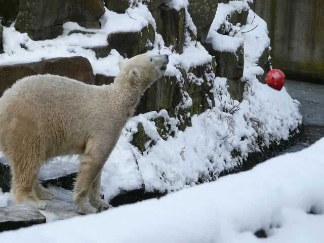 Nachdem Knut einen halben Supermarkt verspeist hatte, wollten wir noch ins Schweinehaus gehen. Aber Knut häkelte umständlich einen blauen Ball aus dem Wasser. Jetzt geht das Ballspiel los! Denkste. Knut schleppte den Ball nach oben auf sein Sandbett, bzw. auf die Stelle, wo es sich unter dem Schnee befindet. Dann legte Knut sich selbst ein Stück entfernt in den Schnee und räkelte sich ausgiebig.