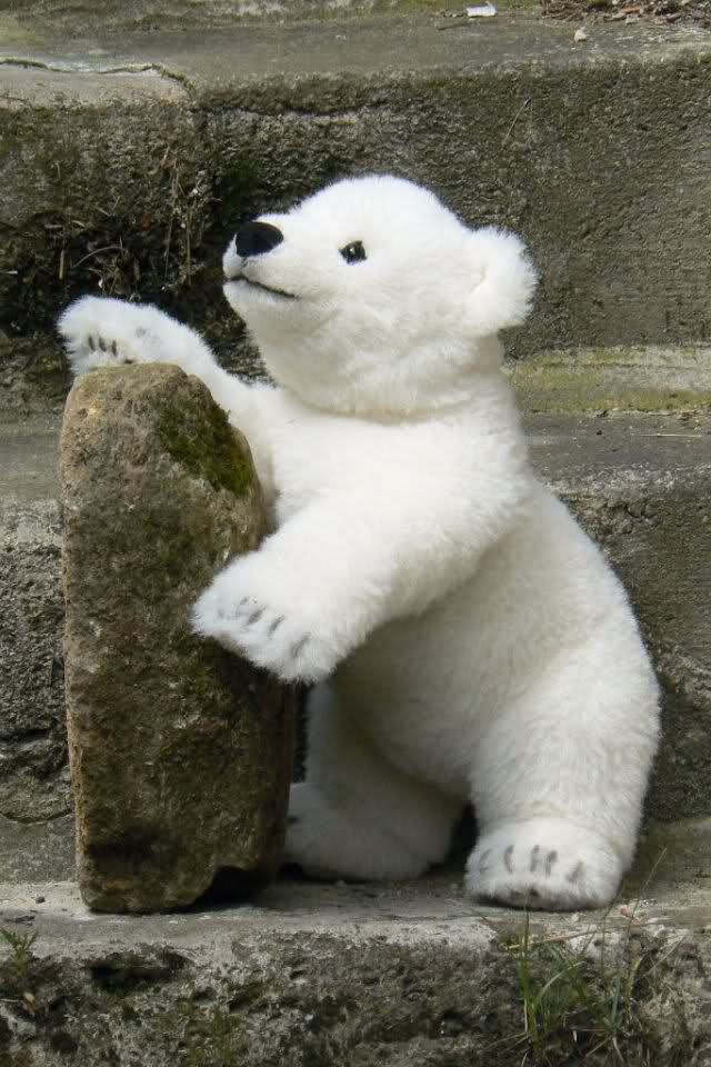 Dann wurde das Drei-Kugel-Teil die Klippe hinauf geschleppt. Dazu kletterte Knut dreibeinig die Treppe empor, mit einer Tatze hielt er die Kugeln an seinen Bauch gepresst. Mühevoll, aber erfolgreich.