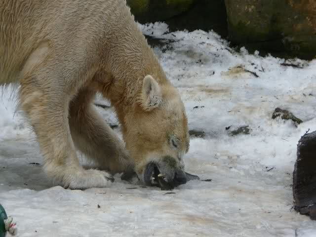 Wir gingen dann zur Fütterung der großen Eisbären, die heute Frau Weckert machte. Sie ist nun wieder aus dem Urlaub zurück, worüber ich mich freute. Weiße Mäuse gab es heute nicht, dafür aber sonst jede Menge Fleisch, Brötchen und Nüsse.
