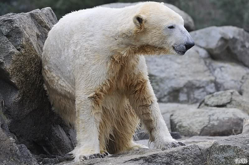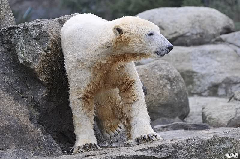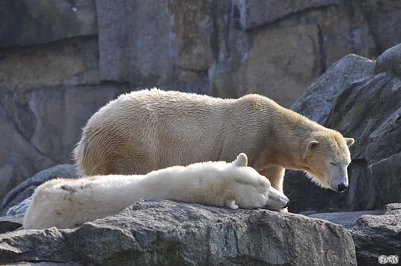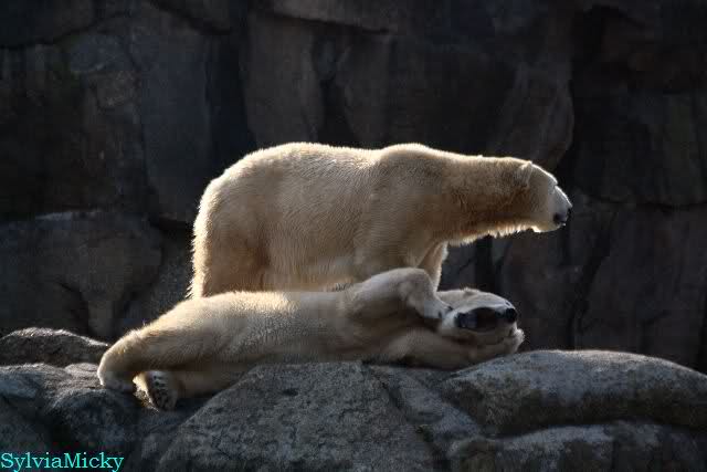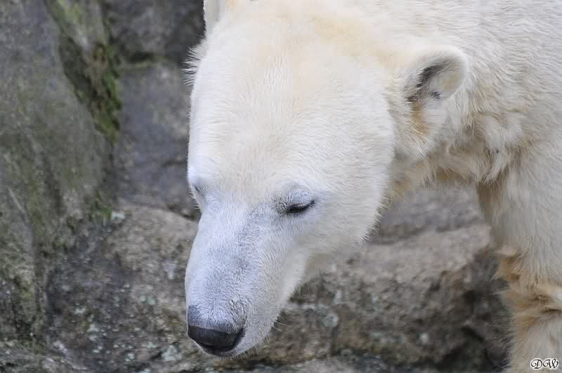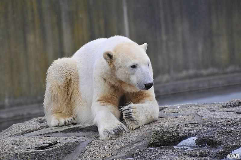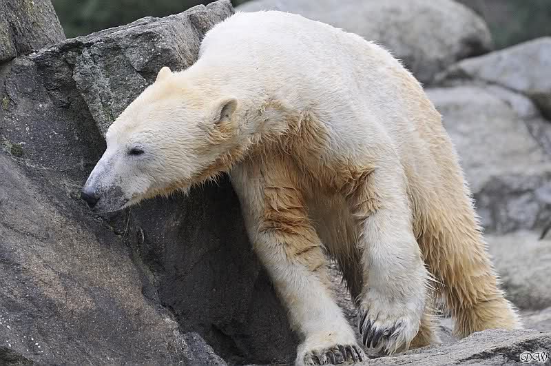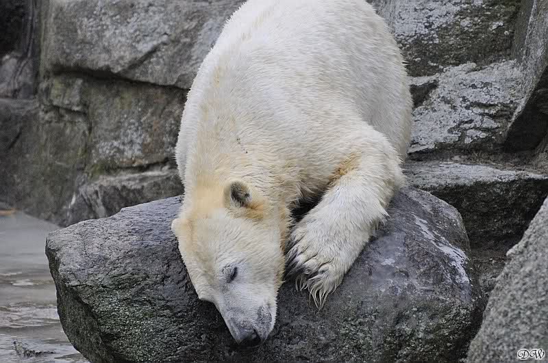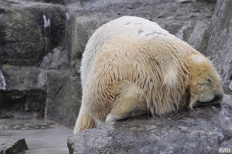 Ja, Knut hat heute viel geruht nachdem er eine Weile mit Tosca gespielt hatte (wie Monika schon berichtete). Nachdem die Mädels drinnen waren, friemelte Knut erst ein wenig vor sich hin. Immer noch auf der rechten Ecke, die ja von vielen als Opferplatz angesehen wird. Dem ist nicht so. Wie auf der alten Anlage auch, hat er sich hier drei Plätze ausgesucht, die er laufend frequentiert. Der Unterschied liegt im Komfort. Hatte er auf der alten Anlage eine Sandkuhle, so hat er hier nur Felsen. Das gilt nicht nur für ihn, sondern auch für die anderen Bären. Schön ist es für keinen.