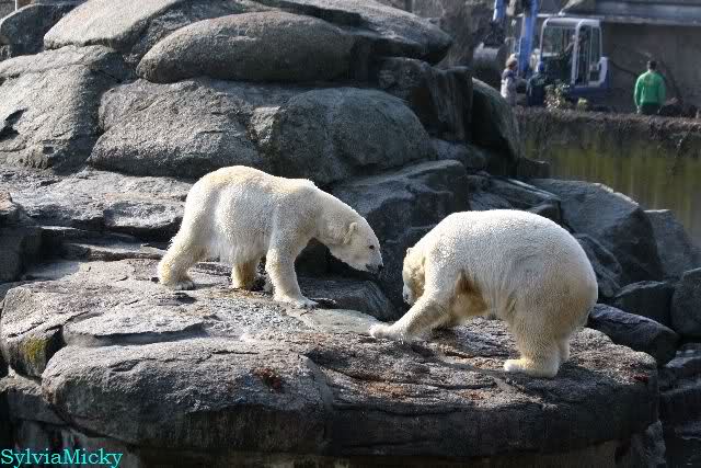 Tosca ging nach der Fütterung wieder ins Wasser und suchte die Reste. Knut ging wieder in seine hintere Ecke. Inzwischen wurde auch der letzte Baum gefällt. Als dann ein Bagger dicht ans Gehege fuhr, kam Knut nach vorne auf das mittlere Plateau, wo er mittags noch lag und die Arbeiter beobachtete.