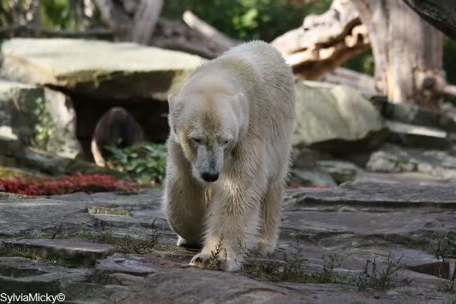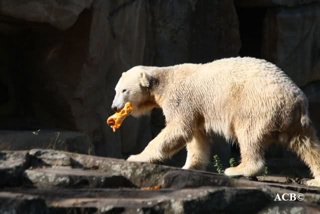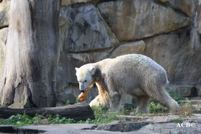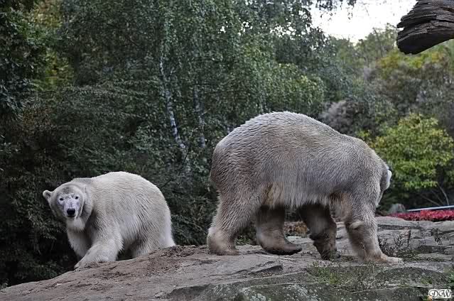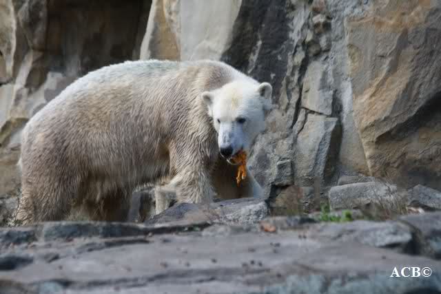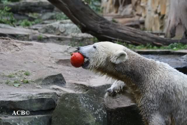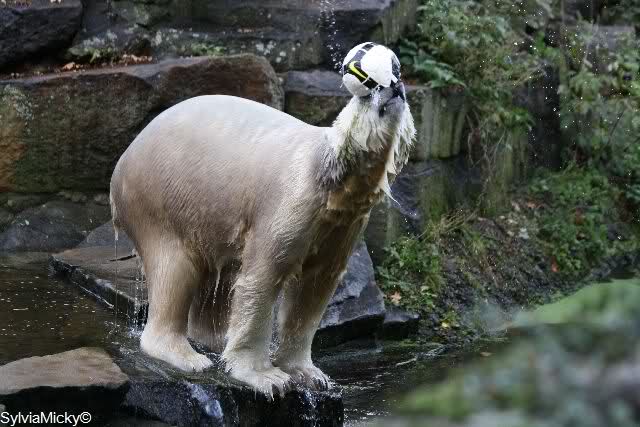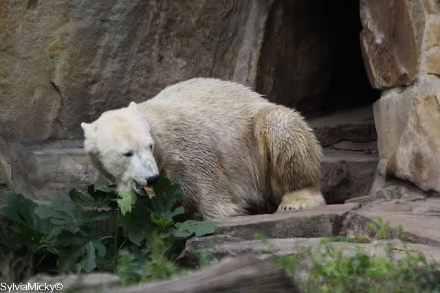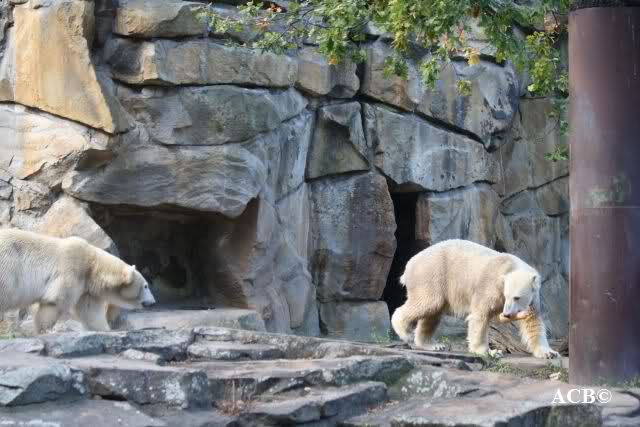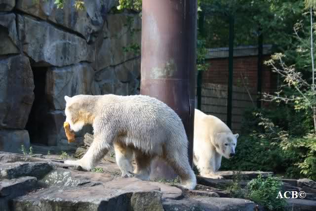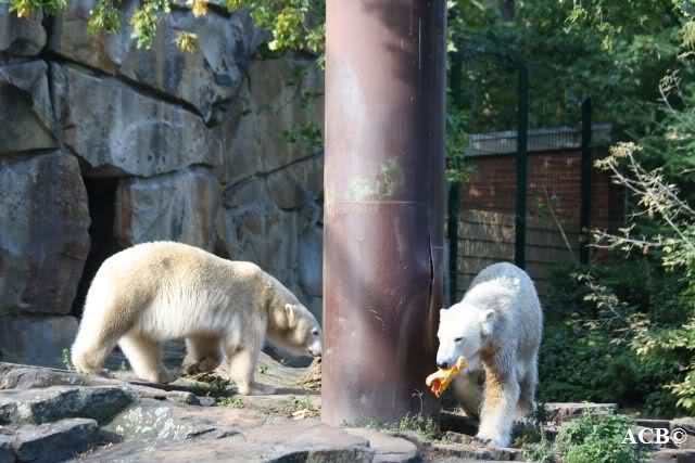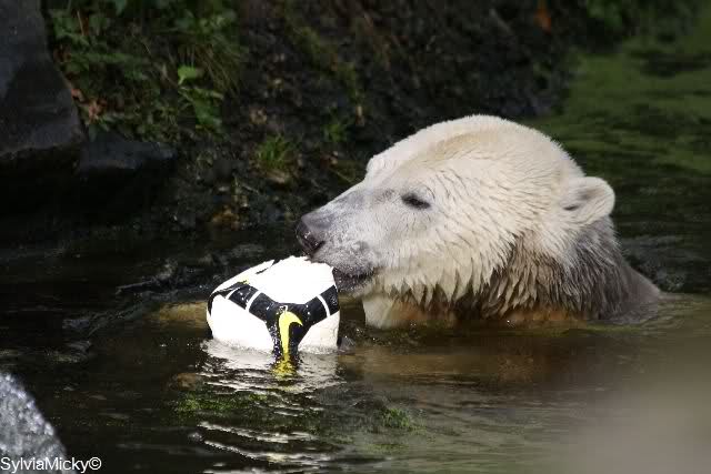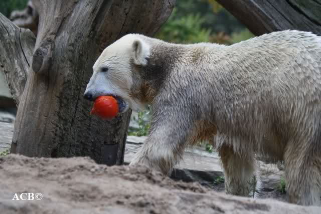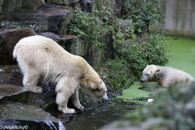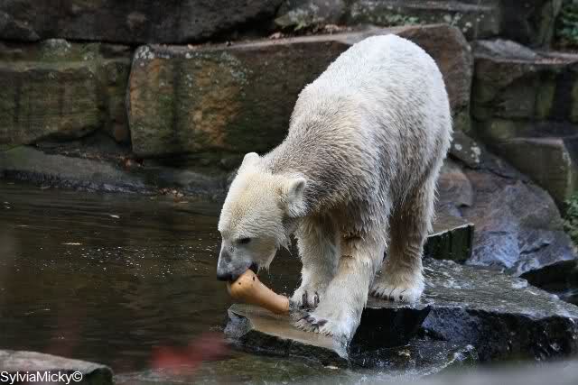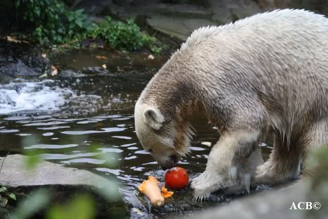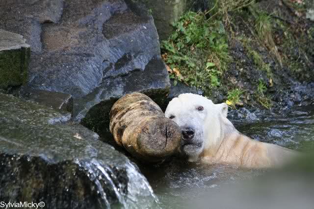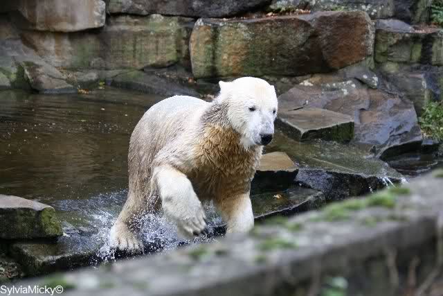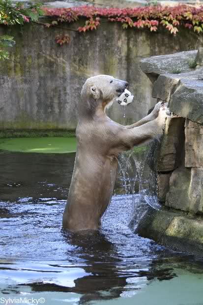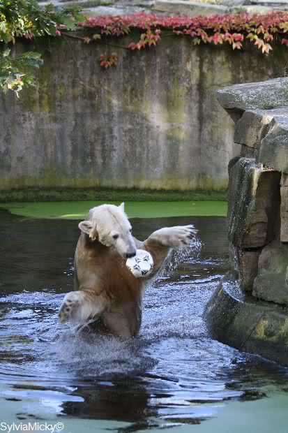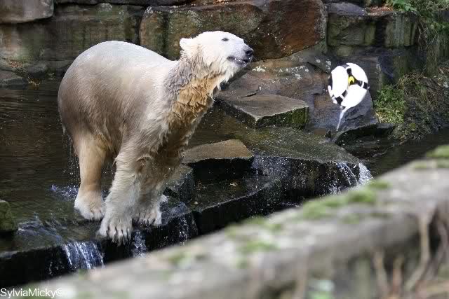 Eine Besucherin erzählte mir, daß sich Gianna seinen Ball aus dem Wassergraben nahm, einmal über die Anlage lief und dann den Ball zu Knut warf.