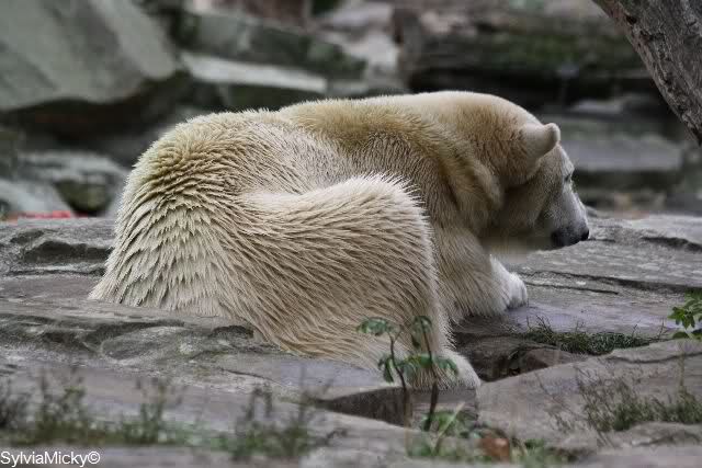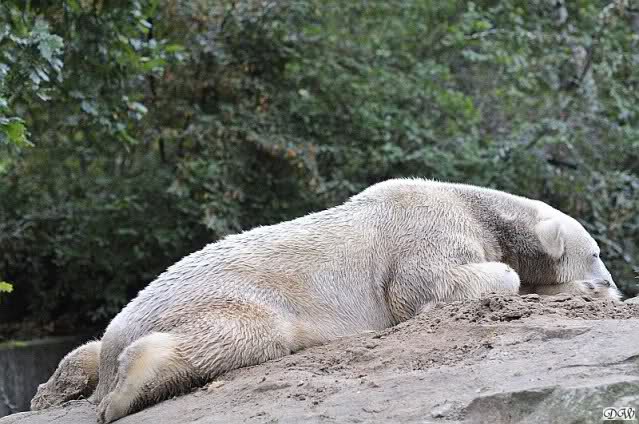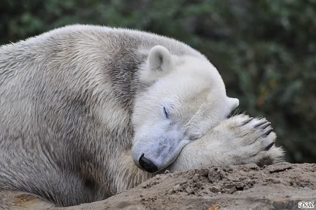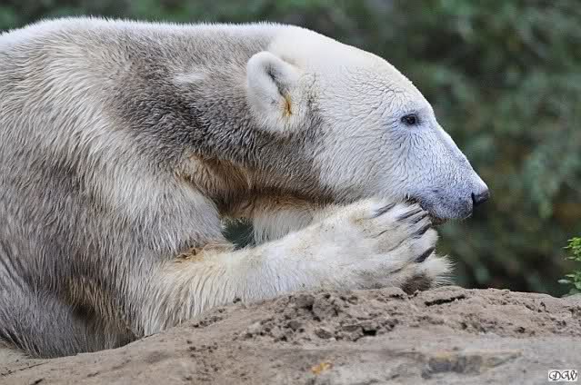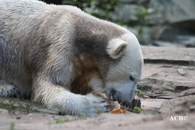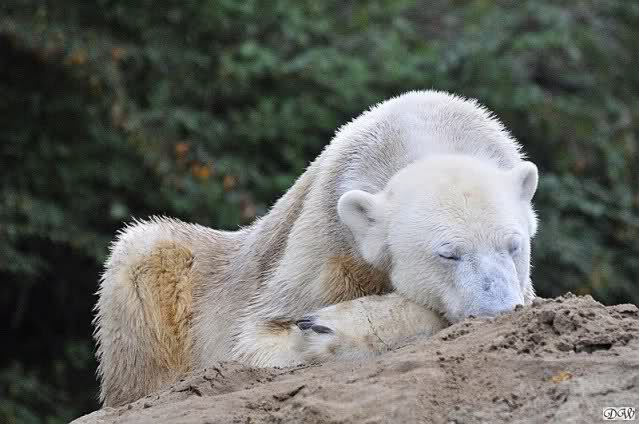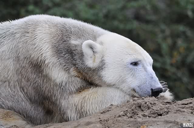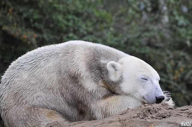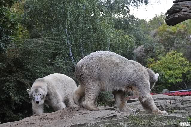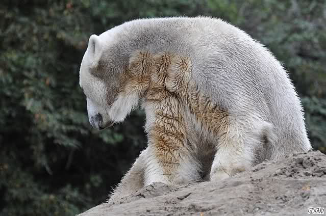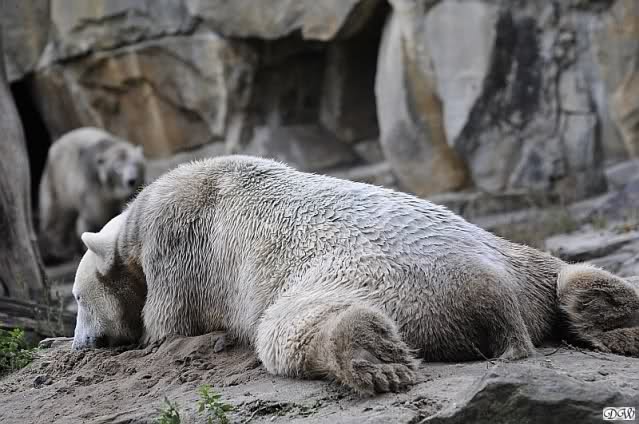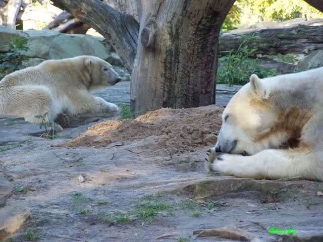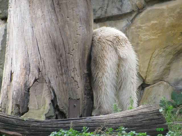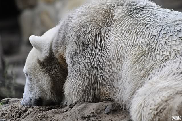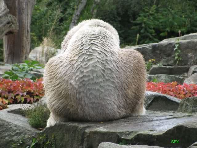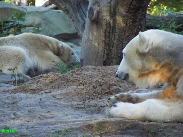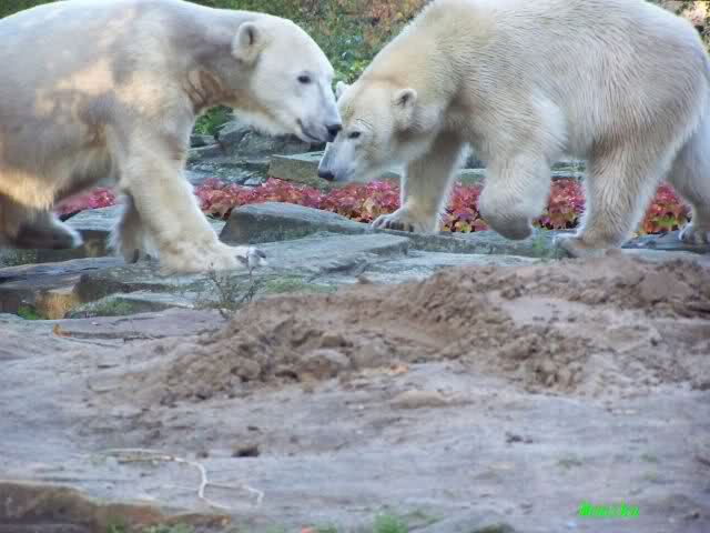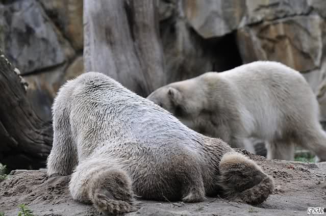 Als wir am späten Nachmittag bei Eiseskälte im Zoo ankamen, war Knut platt! Er lag auf seinem Sandhaufen und war sehr müde. Gianna, die heute ihr schneeweißes Fell nach Knut-manier eingefärbt hatte, hingegen nicht. Sie suchte Kontakt - und sie trieb den armen müden Knut die Wand hoch, oder besser gesagt, vom Sandhaufen hinunter. Wieder und wieder. Es war ein ständiges Ringel, Ringel, Reihe spielen. Knut's Lippe wurde von Zeit zu Zeit immer länger. Wenn sie ihm den Rücken kehrte, machte er Scheinangriffe (sie sah es nicht), fühlte sich besser und legte sich wieder hin. Dann ging es von vorn los: Ring around the Rosy!