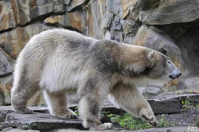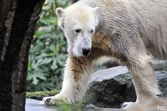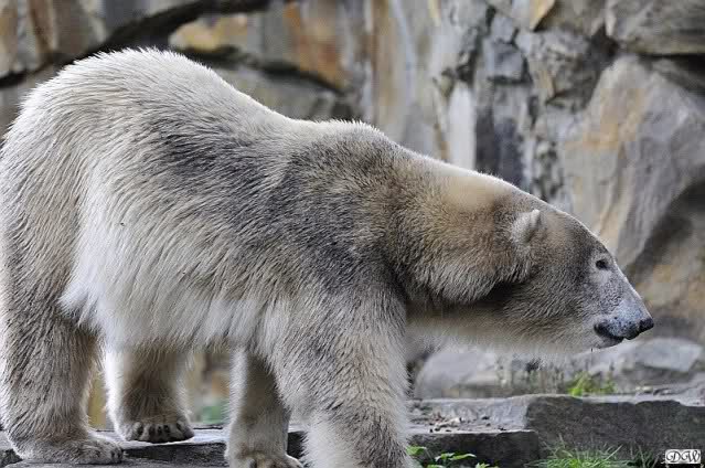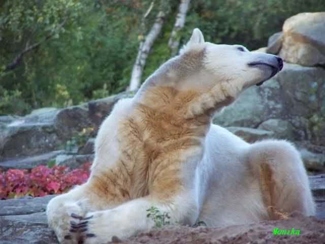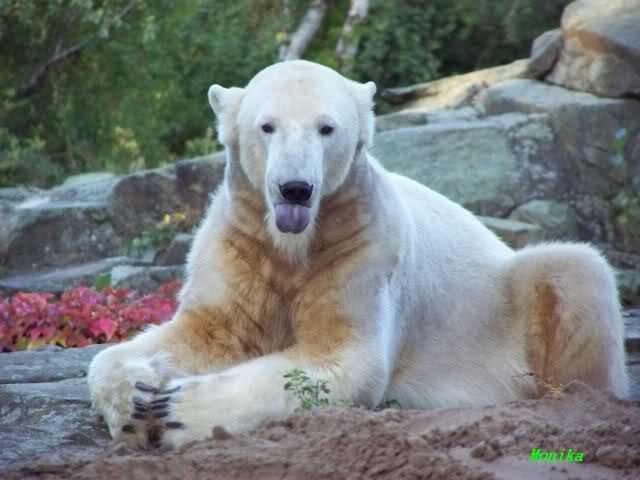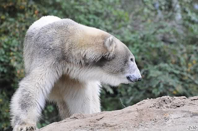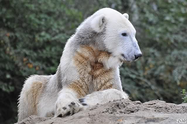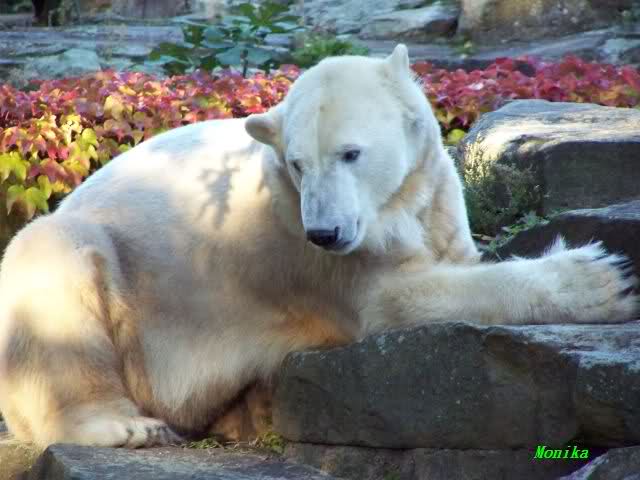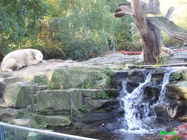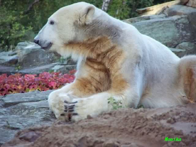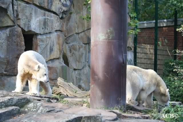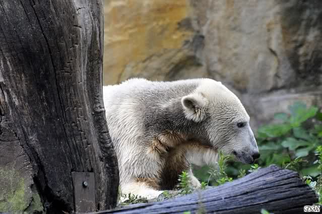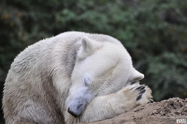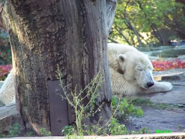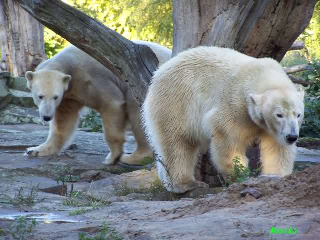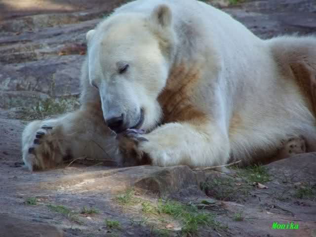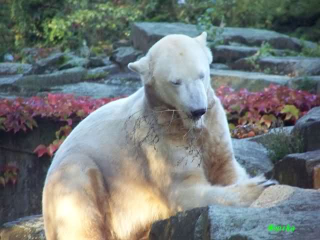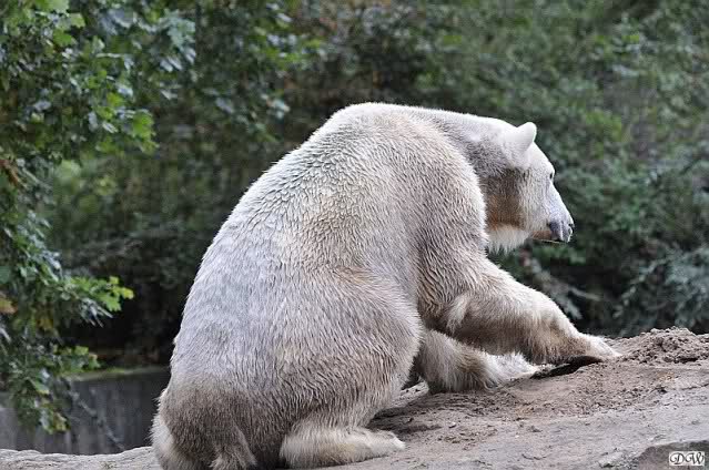 Als wir am späten Nachmittag bei Eiseskälte im Zoo ankamen, war Knut platt! Er lag auf seinem Sandhaufen und war sehr müde. Gianna, die heute ihr schneeweißes Fell nach Knut-manier eingefärbt hatte, hingegen nicht. Sie suchte Kontakt - und sie trieb den armen müden Knut die Wand hoch, oder besser gesagt, vom Sandhaufen hinunter. Wieder und wieder. Es war ein ständiges Ringel, Ringel, Reihe spielen. Knut's Lippe wurde von Zeit zu Zeit immer länger. Wenn sie ihm den Rücken kehrte, machte er Scheinangriffe (sie sah es nicht), fühlte sich besser und legte sich wieder hin. Dann ging es von vorn los: Ring around the Rosy!
