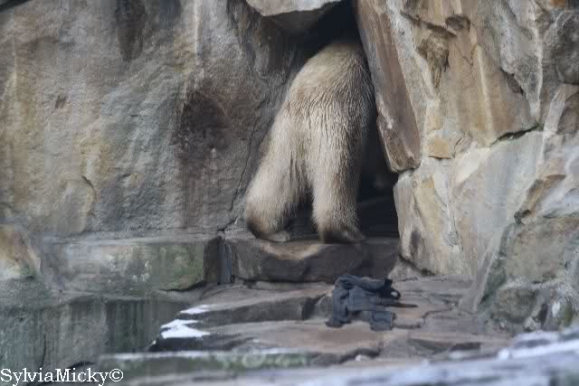 Gianna wollte unbedingt rein. Der Lappen vor ihr ist, glaube ich der Geburtstagsjutesack. Sie nahm ihn und legte ihn in den Höhleneingang. Vielleicht nimmt sie auch alles mit in die Höhle wie Knut.