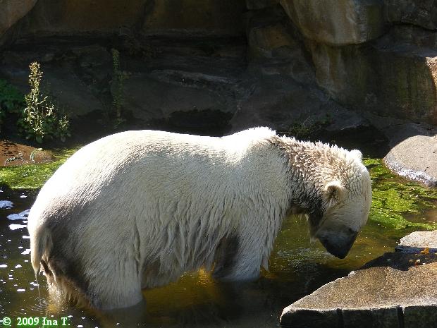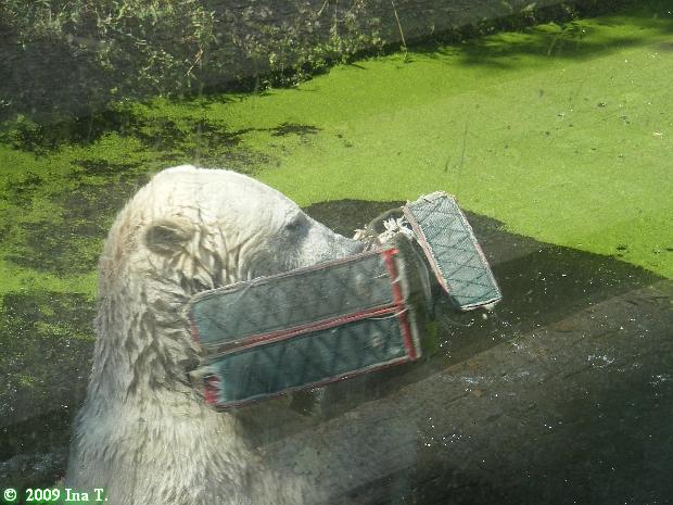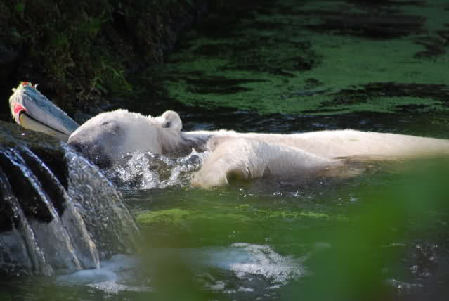 Mit dieser Eisbombe hatte Knut unendlich viel Spaß. Er warf sie ins Wasser, nagte dran, panierte sie, trug sie von oben nach unten, wieder ins Wasser und so ging es über Stunden. Er hatte keine Zeit zum Laufen oder Schlafen sondern beschäftigte sich nur mit der leckeren Eisbombe. Mal lag sie in der Sonne, mal im Sand, dann wieder im Wasser. Die Wespen umschwirrten die Eisbombe und Knut schnappte oder schlug nach ihnen. Die Zunge wurde ihm offensichtlich oft kalt, aber er gab nicht auf. Nachdem er den Großteil verspeist hatte, ging er ins Wasser. Dort spielte er mit Nackthuhn und Baumstamm und manchmal mit beidem gleichzeitig. Für uns wurde es Zeit zu gehen, denn es wurde unerträglich heiß. Der Zoo war heute gut besucht aber nicht so überfüllt wie in den letzten Tagen.