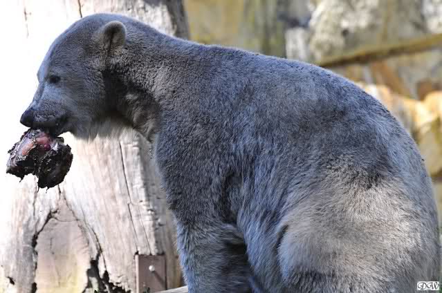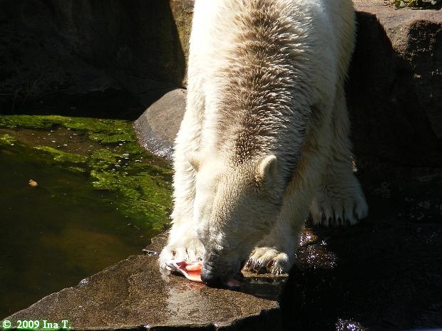 Die Fütterung der großen Eisbären machte heute wieder Herr Röbke. Lars bekam natürlich einige Fleischstücke ins Maul geworfen. Aber dann ließ Herr Röbke ein Stück Fleisch einfach hinter der Mauer ins Wasser fallen. Lars, ganz gentlemen-like, guckte sich nach seinen Damen um. Wer will und hat noch nicht? Aber dann war auch schon Nancy da und holte sich den Brocken.