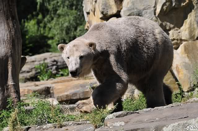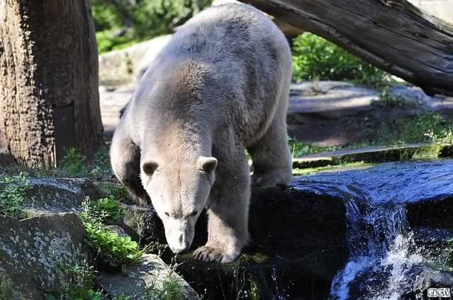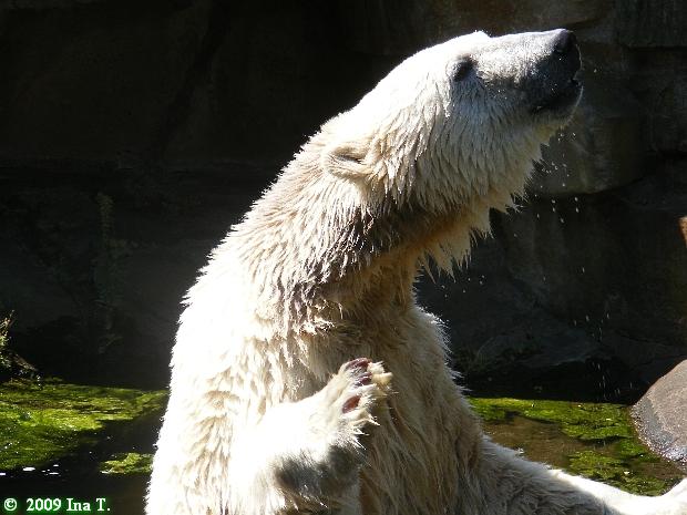 Dann stieg er aus dem Wasser, ein wundervoller, weißer Bär. Aber nicht für lange. Dann suchte er wieder seine Schminkecke auf. Was Knut dann weiter tat, habe ich nicht mehr gesehen. Es war nämlich schon ziemlich spät geworden. Der Zoo war wieder in ein wunderschönes Abendlicht getaucht. Zum Dableiben schön.
