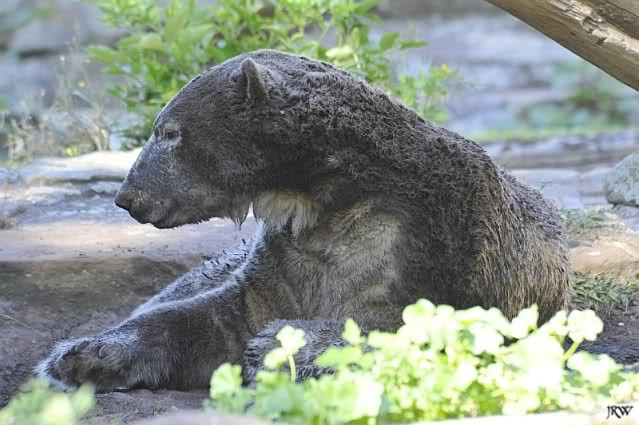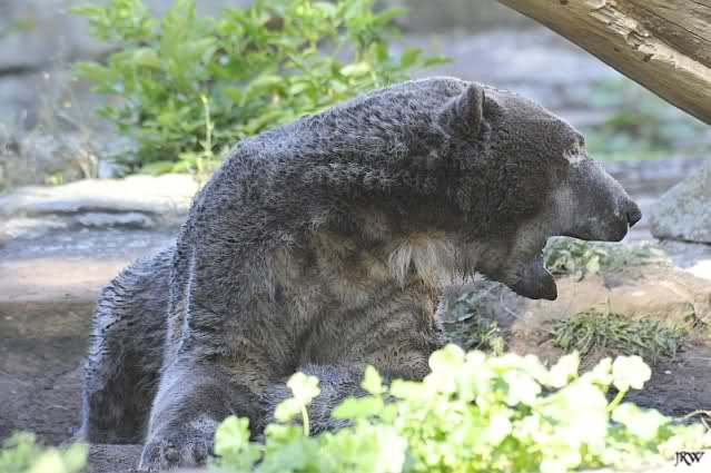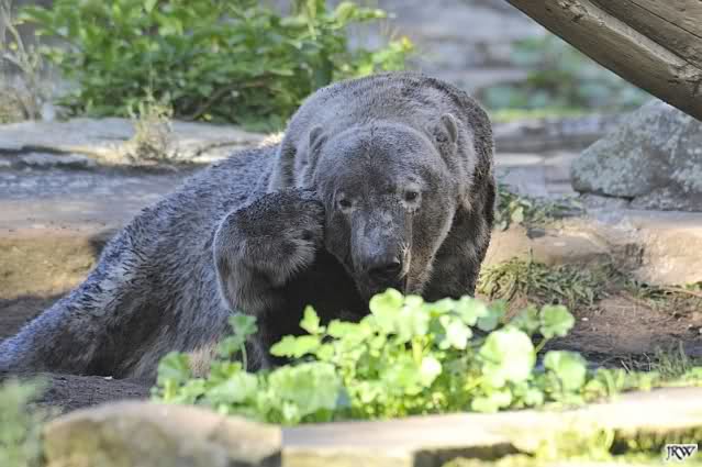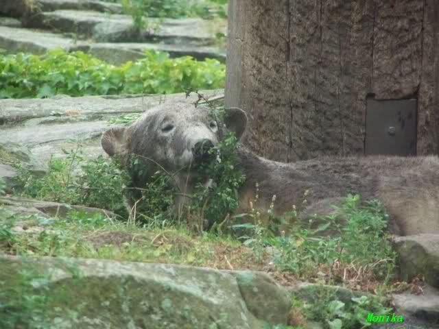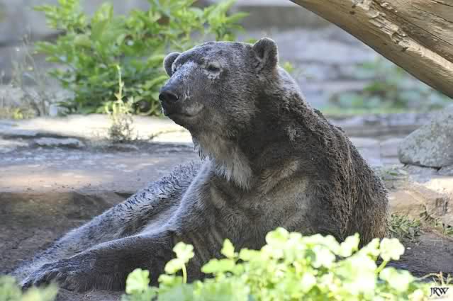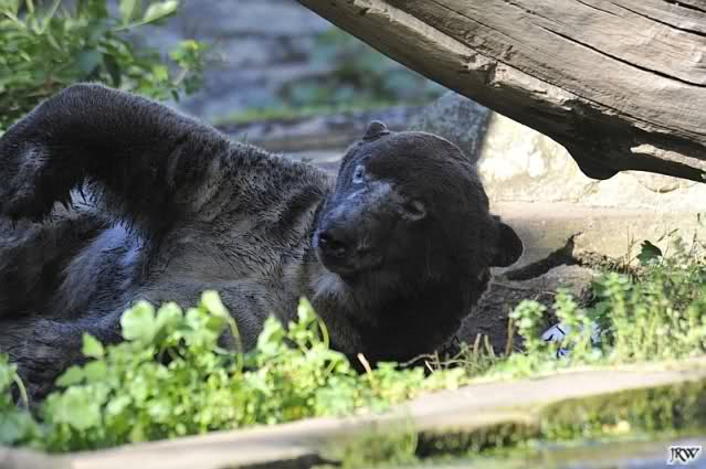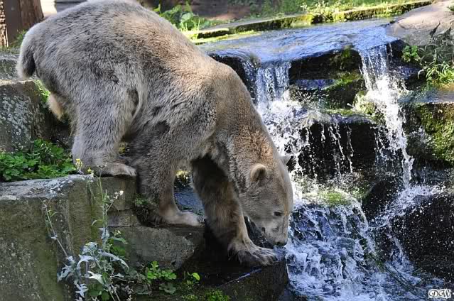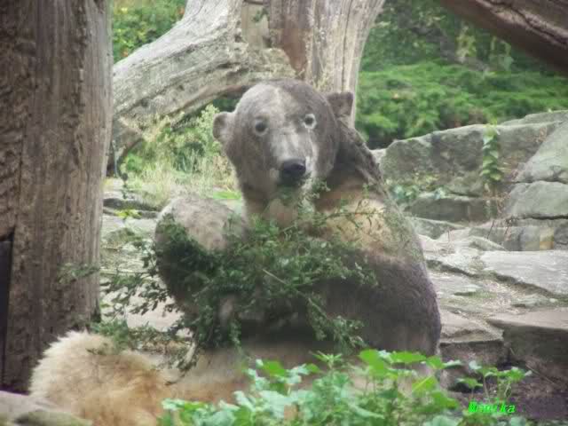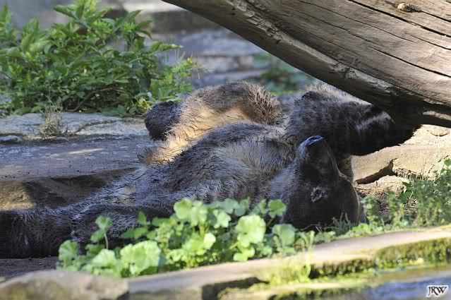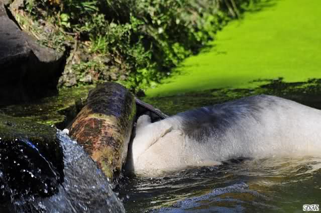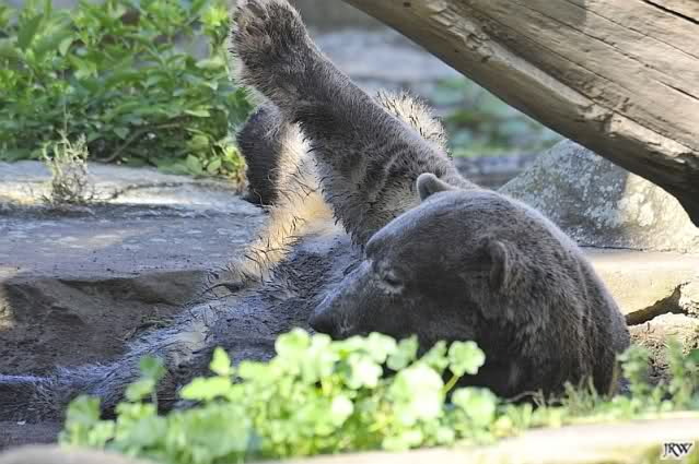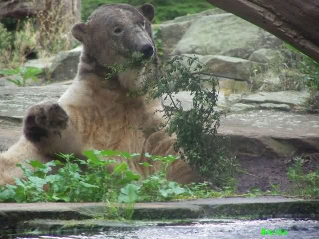 So leer wie heute um 11.00 habe ich den Zoo schon lange nicht mehr gesehen. Es lag wohl auch am Gewitter am frühen Morgen und den Regenfällen. Knut schien aber das Gewitter gut verkraftet zu haben. Er schlief um 9.00. Später tobte er sich wieder im Wasser aus.