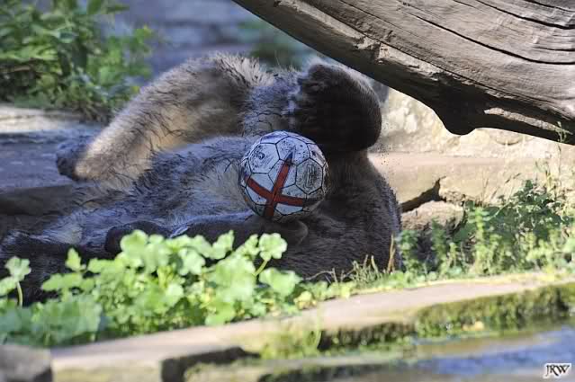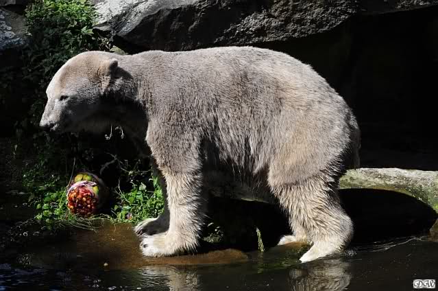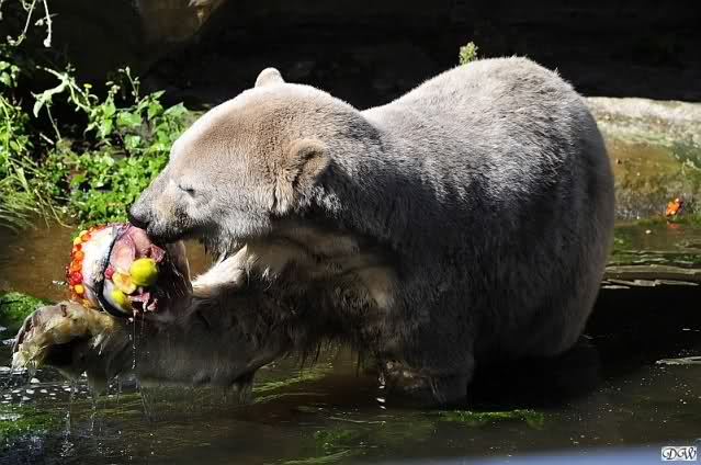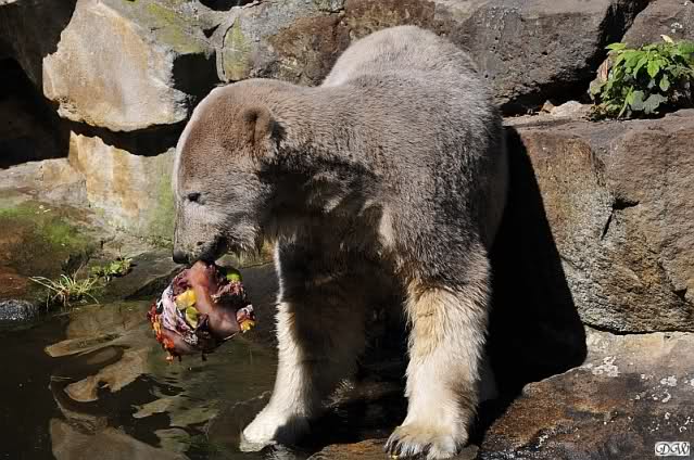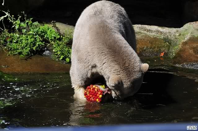Hello to you all Knut friends around the world at evening on Germanys hottest day in year. It was a very very hot day with very high temperatures. Not good for our polar bears. Knut got a *ice bomb* with fruit and vegetables. We don´t know the big polar bears got *ice bombs* too.