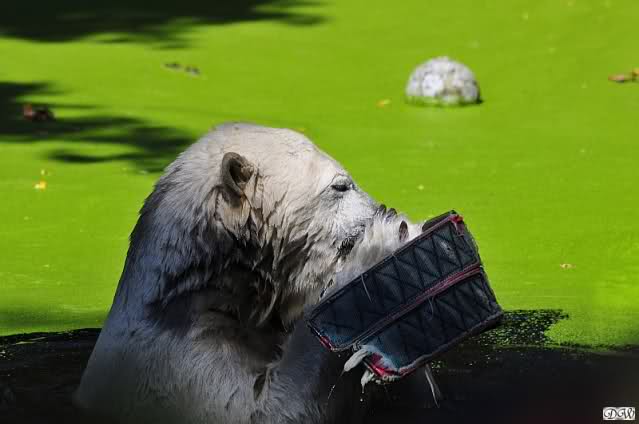 Zurück zu Knut. Der war wieder im Wasser und hatte sein Aussie-Dog beim Wickel. Es wurde hin und her geschleudert, dass es nur so klatschte. Aber Knut passt jetzt auf, dass das Ding nicht zurückhaut. Er hält jetzt immer eine Tatze dazwischen, um sich selbst keine Ohrfeigen zu verpassen. Kluger Bär.