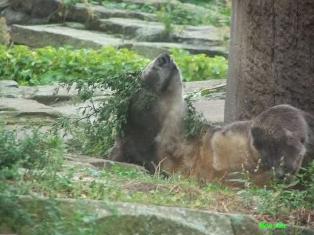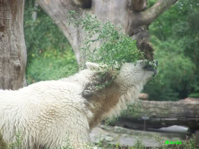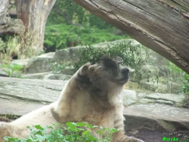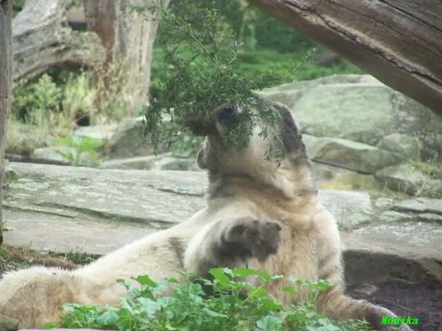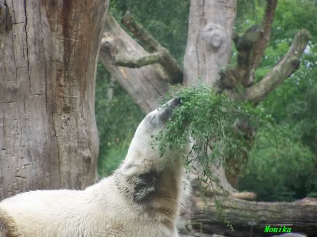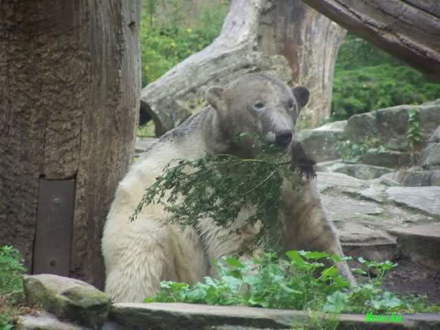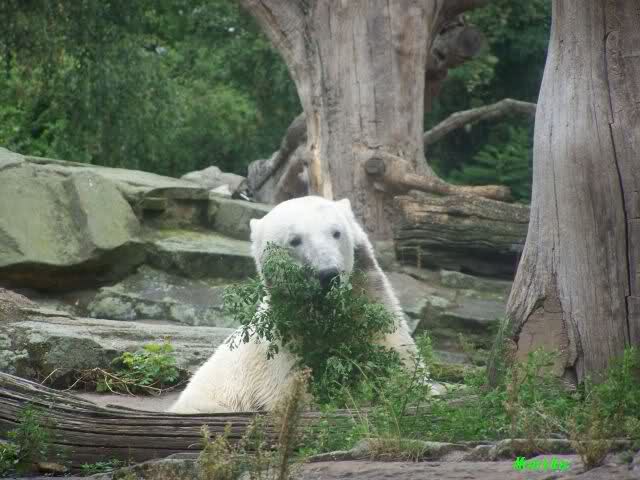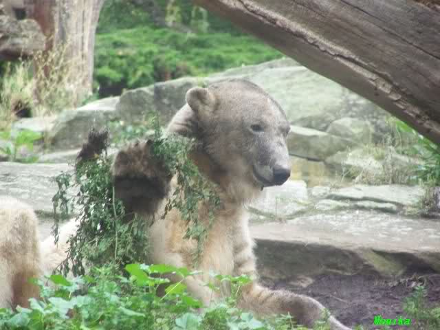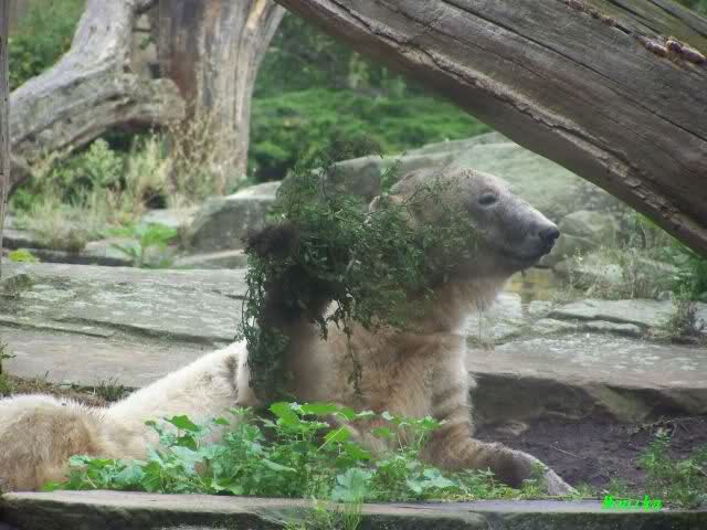 Wie Sylvia schon erwähnte, war es im Zoo heute Vormittag sehr ruhig. Auch am Nachmittag war es sehr angenehm. Mittags spielte Knut ausgelassen mit seinem Nackthuhn. Nach dem Essen zupte er wieder eine Pflanze aus seinem Garten und spielte sich damit in den Schlaf.