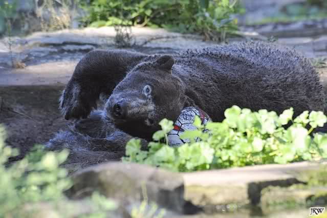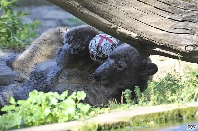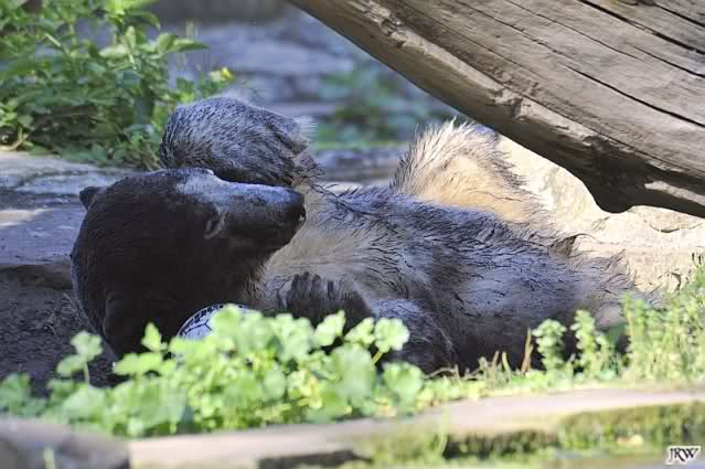 Also ging ich geradewegs zu Knut. Der war heute Morgen sehr aktiv und kämpfte im Wasser mit seinem Aussie-Spielzeug. Es machte Spaß, ihm zuzusehen. Dann stieg Knut aus dem Wasser und ging zu seiner Kuhle hinter dem Baumstamm. Dort verwandelte er sich im Handumdrehen in den schwärzesten Bären, den ich je gesehen hatte! Es schien immer noch nicht genug zu sein, Knut suhlte sich genüsslich in der schwarzen Erde herum und schien sich dort pudelwohl zu fühlen. Dann kam er wieder hervor und zeigte uns seinen neuen schwarzen Pelz. Heute fiel mir wieder auf, dass Knut wieder ein Stückchen erwachsener geworden ist.