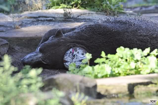 Heute war es in Berlin ja irrsinnig heiß. Aber die Rasensprenger, die überall aufgestellt waren und auch der Schatten der Bäume machten den Zoo zu einer angenehmen Oase. Ausgedehnte Pausen taten ein übrigens. Als ich gerade in der Waldschänke saß, kam eine Knutfreundin und erzählte mir, dass ich etwas sehr Interessantes verpasst hätte. Knut hat so gegen elf Uhr eine große Eisbombe bekommen. Er hatte lange daran zu tun gehabt und sei mit den Resten immer noch beschäftigt. Außerdem sei der RBB gekommen und wolle filmen, wie sich so der heißeste Tag von Berlin im Zoo anließe.