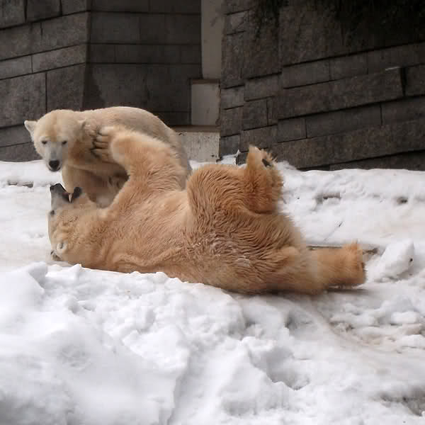 Am Sonntag Morgen konnten Zoo-Besucher/innen ein ausgelassenes Eisbärenpaar beim ausgiebigen Spiel beobachten.