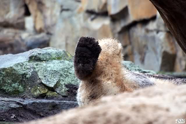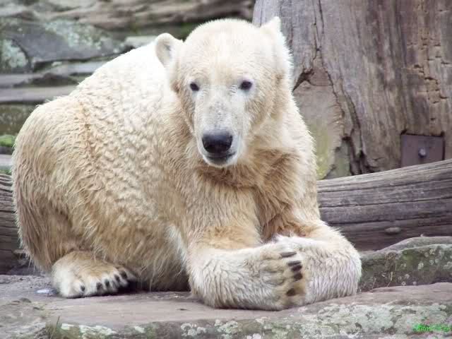 Als ich heute Nachmittag in den Zoo ging ruhte Knut auf seinem Sandhaufen. Von sehr netten Knutfreunden aus Stuttgart bekam ich von der Frühschicht vermittelt, daß Knut lange im Wasser mit seinem Nackthuhn spielte und sehr munter war. Danke dafür.