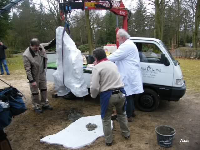 Der schwere Grabstein wird abgeladen. Die untere Platte symbolisiert eine Eisscholle, auf die der schwere "Eisberg" einzementiert wird.
