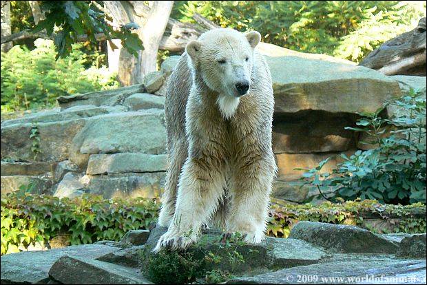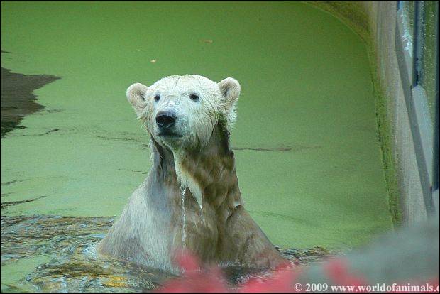 Er wurde heute Nachmittag wieder auf der Anlage gefüttert. Gianna war drinnen. Nach der Fütterung ließ man Gianna wieder raus. Knut war an seinem Teich und pfriemelte in aller Ruhe an seinem Kürbis. Gianna raste über die Anlage, sprang von der rechten Seite ins Wasser. Knut hat sich sehr erschrocken und lief sofort hoch. Ich bin dann gegangen.