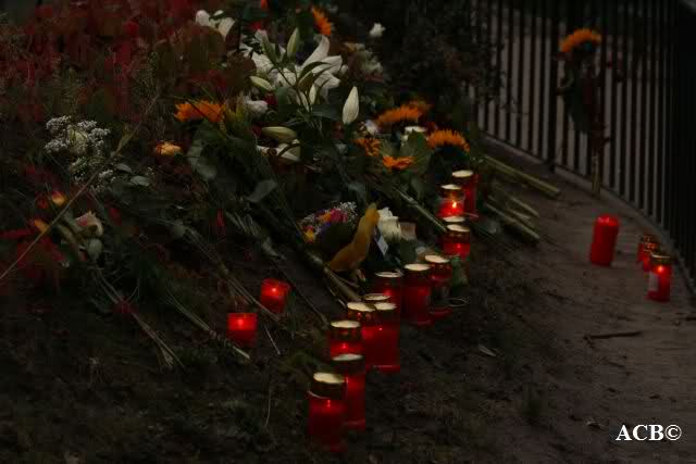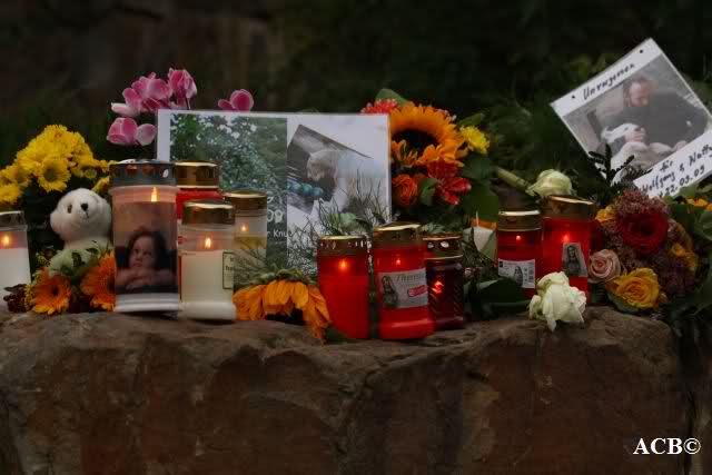 Es waren heute sehr viele Menschen an Knuts Anlage. Viele kamen mit Blumen und Kerzen. Allerdings war es mehr Volksfest als stilles Gedenken. Leider kam auch der Fotograf mit der Leiter und verbreitete duch seine Anwesenheit ziemlichen Unmut.