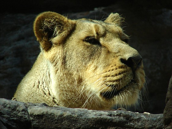 Wer das alte Haus kennt, weiß ja, wie es dort ausgesehen und vor allem gerochen hat. Davon ist nichts mehr übrig. Man betritt einen wunderschönen Raum, der mich durch das weiße Kuppeldach, das auf den renovierten Sandsteinsäulen aufliegt, sofort an einen Tempel erinnert hat. Es gibt keine Gitterstäbe mehr, sondern unten Glaswände und oben Stahlseilnetze. Die Rückwände sind aus Sandstein, teils Natur, teils nachgebildet, ich als Laie kann gar nicht sagen, was da echt ist und was nicht. Und auf dem Boden der Gehege gibt es keine Fliesen mehr, sondern Rindenmulch. Angeblich lässt sich das trotzdem so reinigen, dass es nicht mehr stark riecht, da bin ich gespannt. Aber schlimmer als vorher kann es kaum werden Die Tiere können sich in den oberen Teil der Gehege zurückziehen, so dass man sie von unten nicht sieht, wenn sie keine Lust auf Publikum haben. Die Tiger hatten gestern tatsächlich keine, außer mal einem Fuß war nichts zu sehen. Aber das war mir nicht wirklich wichtig, Hauptsache ist, dass alle vier Raubkatzen wieder da sind und die lange Zeit auswärts gut überstanden haben. Immerhin ließ sich Thar, der Löwenmann, an der Scheibe blicken, während seine Gefährtin Keera von oben das Geschehen betrachtete und sich dann irgendwann zu einem Schläfchen zurückzog.