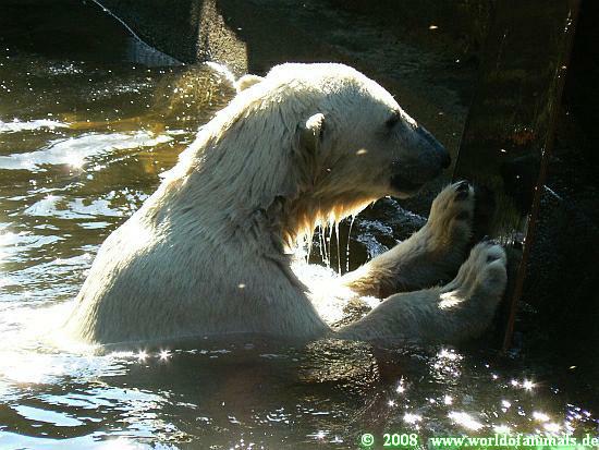 Im März 2009 soll mit dem Bau eines neuen Eisbärgeheges begonnen werden. Wo die drei Eisbären dann untergebracht werden, ist noch nicht klar. Natürlich habe ich sofort nachgehakt und meinte, dass zumindest Gianna "auf Probe" bei Knut untergebracht werden kann. Aber da kam nur ein (sehr nettes) Lächeln vom Pfleger...