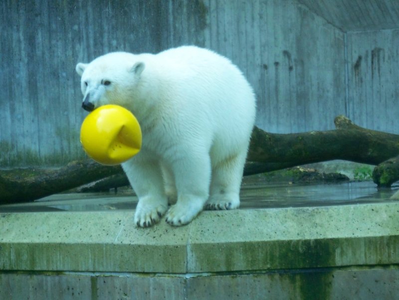 Aber ein Blick zu Knuti musste noch sein. Ich kam gerade zur rechten Zeit. Knut hatte den Jutesack besiegt und den Ball befreit. Er schnappte nach dem Ball und schleuderte ihn immer wieder hoch in die Luft. Es sah aus, als ob Knut regelrecht über den Ball triumphiert.