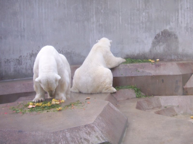 Die beiden großen Eisbären Yogli und Lisa (die Großmutter von Knut) waren währenddessen in einem sehr kleinen Gehege beim Fressen. Die Stellung von Yogli ist bald wie bei einem Teddy, der sich auf einem Sofa hinlegt, oder nicht?