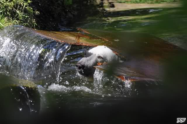 Sie ist so spielfreudig, klettert oben auf den Felsen, wirft zuerst den Ball den Wasserfall hinunter und dann stürzt sie sich selbst in die Fluten - nett zuzusehen!