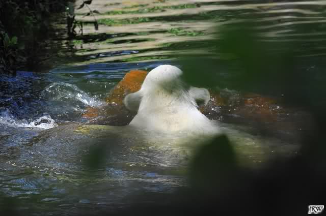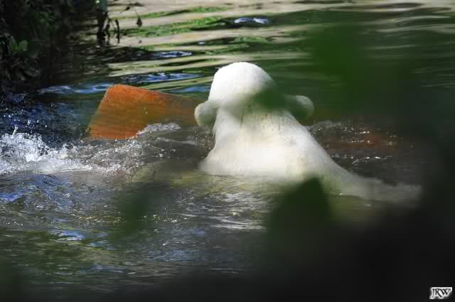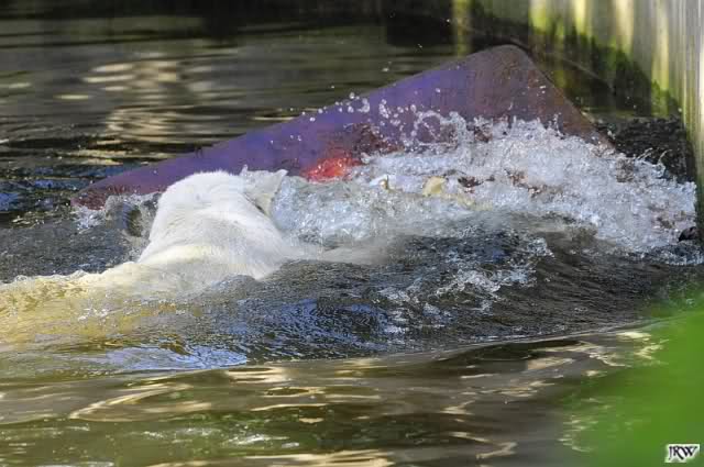 Nach der Fütterung ging ich zurück zu Knut. Der war im Wasser und bearbeitete einen Jutesack. Der Sack hatte inzwischen eine gazeartige Struktur angenommen und ein bunter Ball leuchtete hervor. Den wollte Knuti natürlich haben und er friemelte an dem Sack herum wie Ernst.