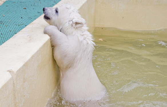Flocke als Animateurin: "Hallo, wo bleibt ihr denn? Kommt doch auch ins Becken und planscht mit mir. Von wegen zu kalt: Herrliche Wassertemperatur heute. Meine aufgestellten Nackenhaare bedeuten nicht, dass ich friere. Sie zeigen, wie super ich mich im Wasser fühle. Na, wer hat denn nun Lust auf eine Runde schwimmen mit mir?" (Foto: Ralf Schedlbauer)