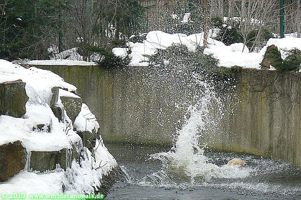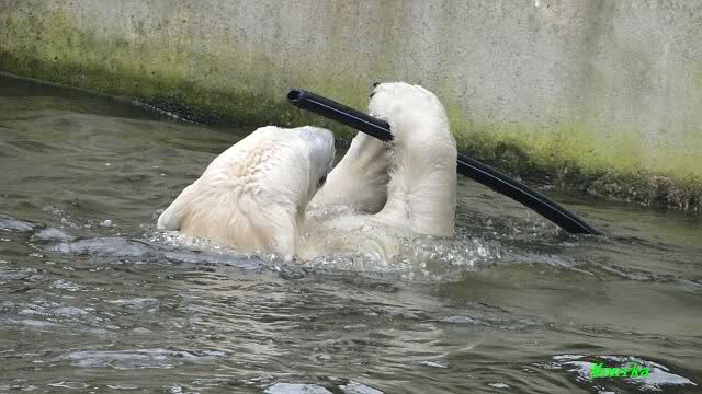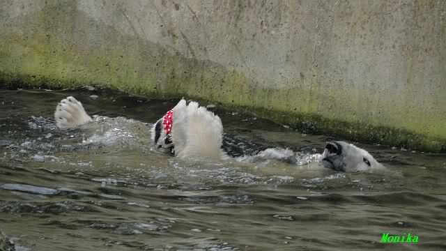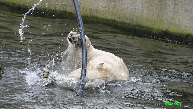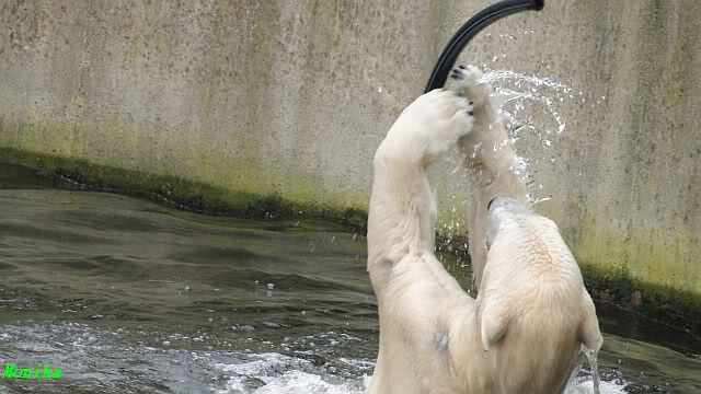 Nach der Fütterung spielten beide kurz im Wasser. Als Knut wieder an Land ging, drehte Gianna wieder auf, sprang ins Wasser und spielte mit dem Schlauch.