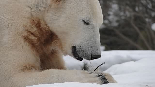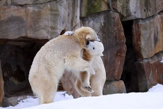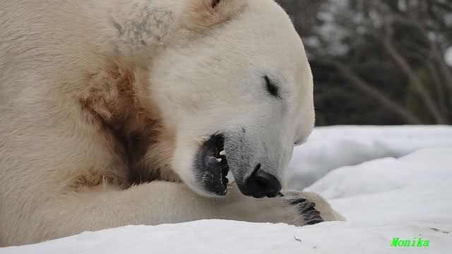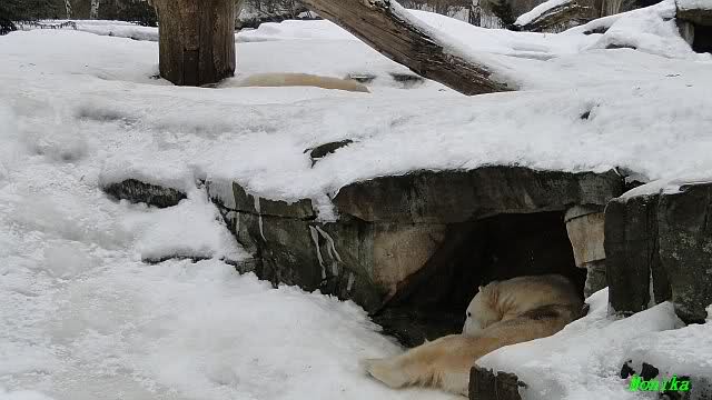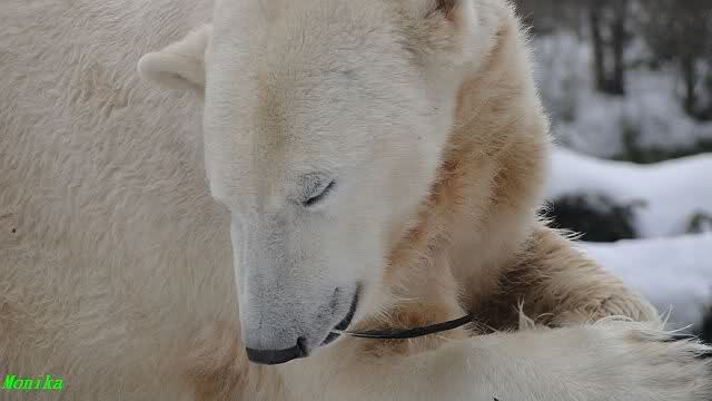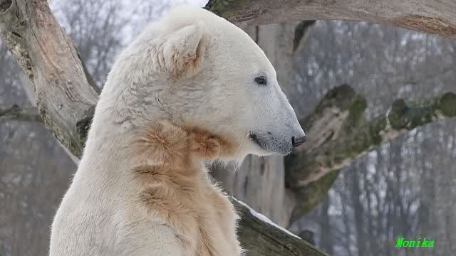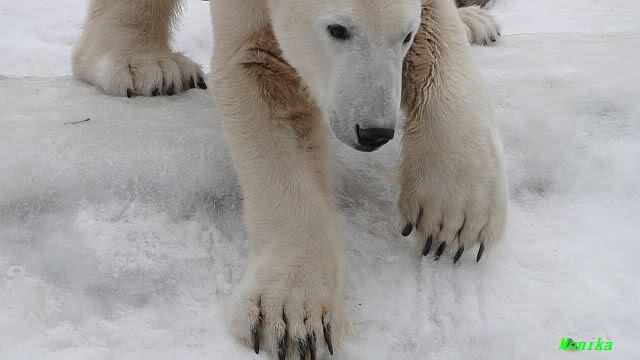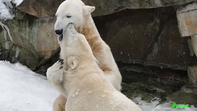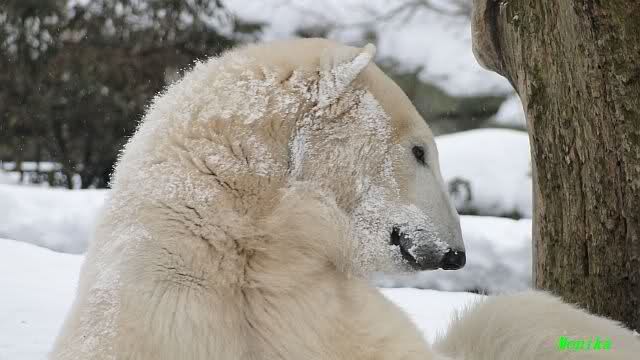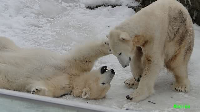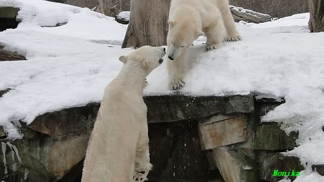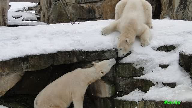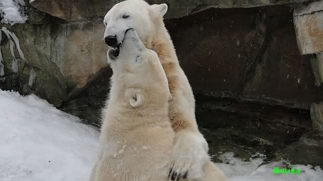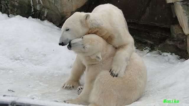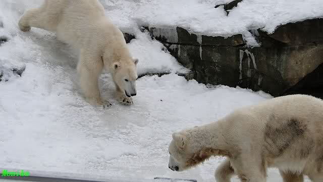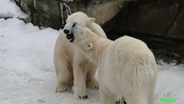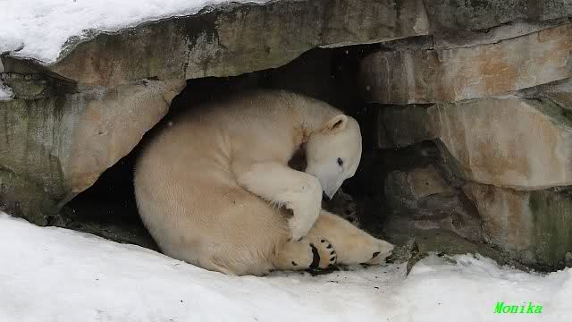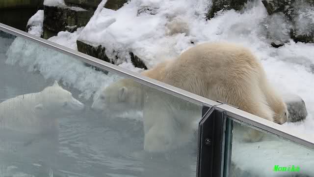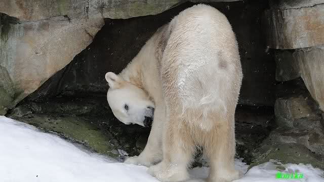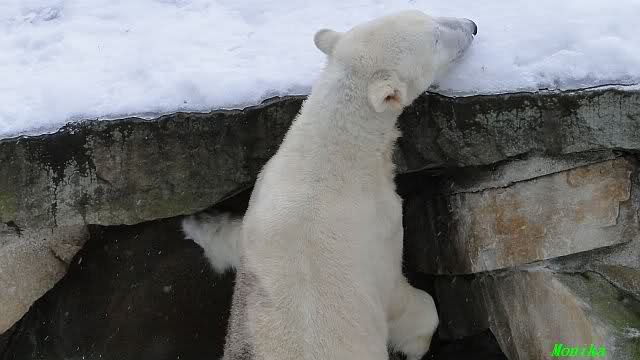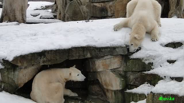 Bei leichtem Schneegriesel wurde heute endlich wieder geschmust und gespielt. Knut ging (rutschte) heute ziemlich schnell nach unten zum Pool und kratzte ausdauernd am Eis, um festgefrorene Federn zu bekommen. Dann lag er lange in der kleinen Höhle am Pool. Gianna machte es offensichtlich Spaß, Knut von oben Schnee auf den Kopf rieseln zu lassen.
