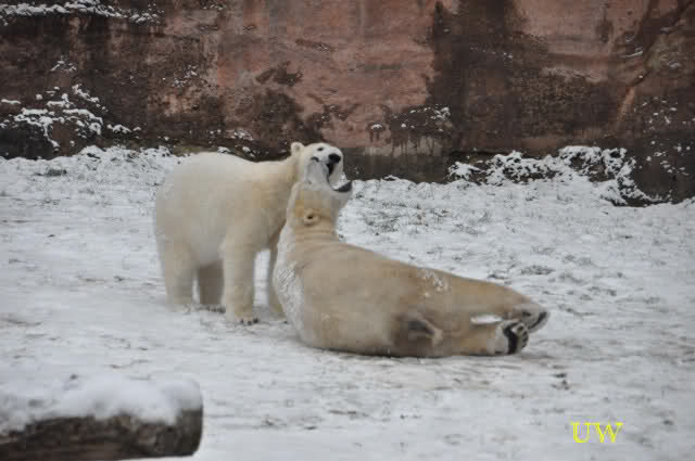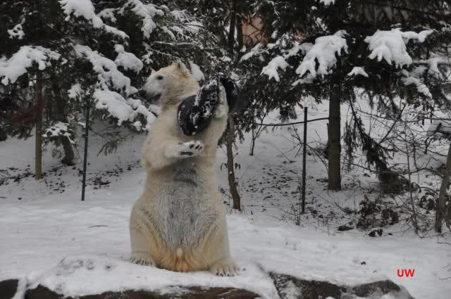 Auch Flocke hat zuweilen eine neue Beschäftigung: damit das Wasser nicht zufriert sind verschiedene Sprudeldüsen im Boden des Beckens installiert. Wenn diese laufen stürzt sie sich genau darauf und tobt im Sprudel herum, wahrscheinlich will sie dort die Luftblasen fangen. Rasputin interessiert der Sprudel seltsamerweise wenig.