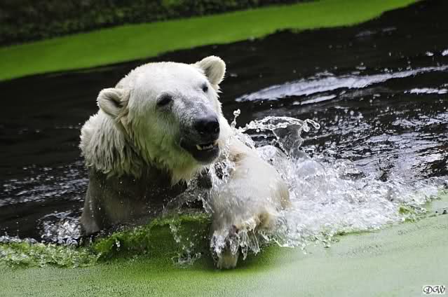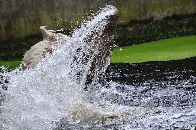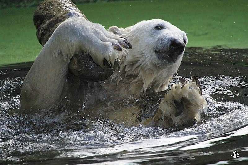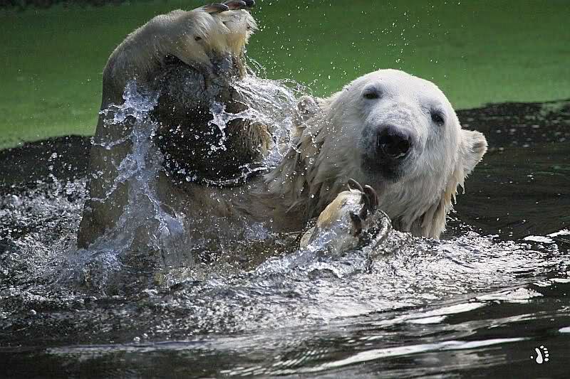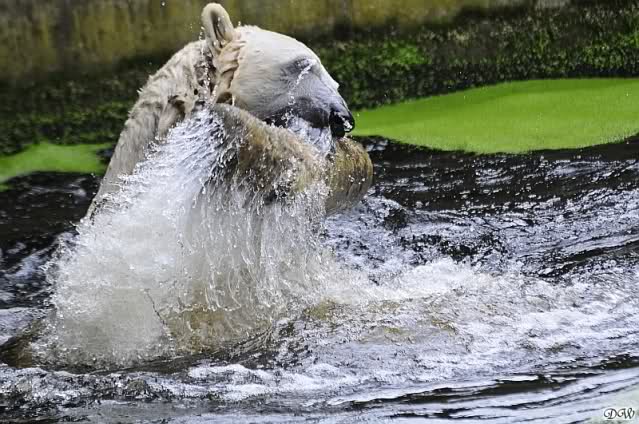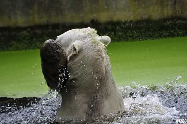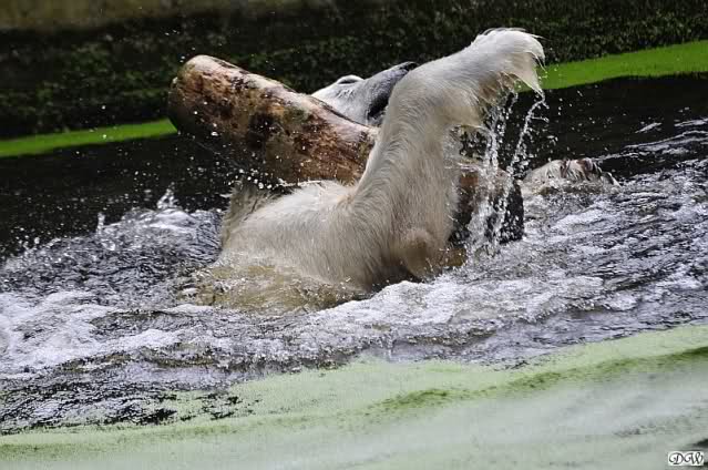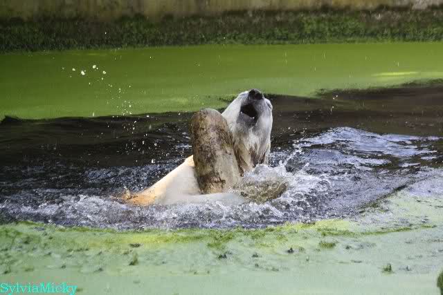 Knut war heute Morgen schon im Wasser und tobte lange ausgelassen mit seinem Baumstamm und dem Schlauch. Der Ball wurde auch wieder zu den Besuchern geworfen.