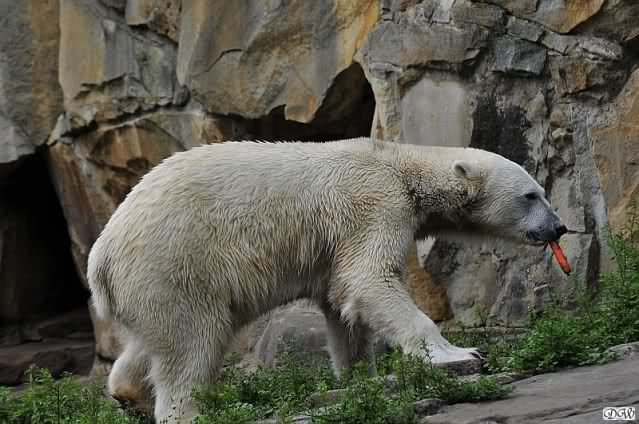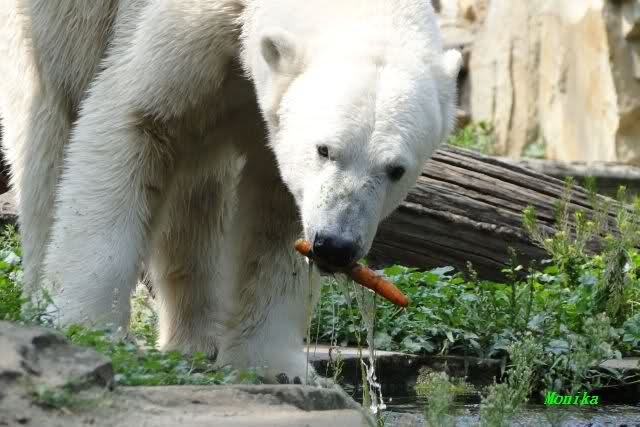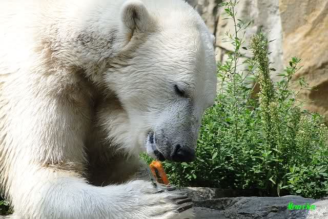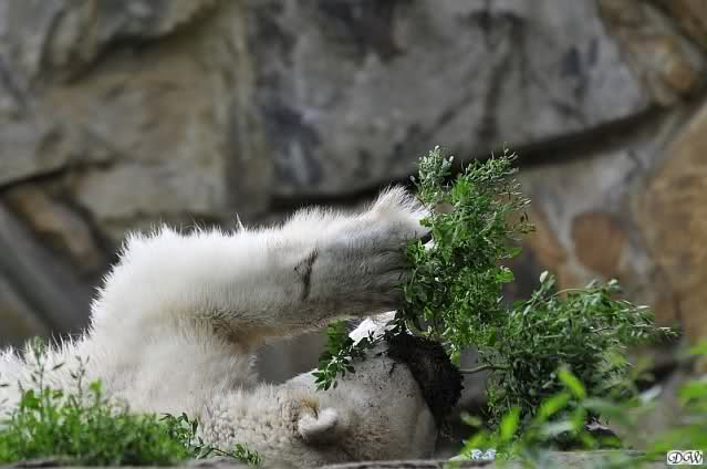 Knut hatte einen guten Tag. Er tobte im Wasser, friemelte mal mit seinem Zweig, mal mit einer Pflanze, die er ausgerissen hatte. Im Wasser spielte er wieder so intensiv, dass Frau Weckert ihn zweimal rufen musste. Als er sie endlich hörte, legte er einen Spurt hin, der ihm bestimmt eine Medaille gebracht hätte. In aller Ruhe suchte er seine Anlage ab und sammelte die nun nicht mehr rationierten Möhren ein. Ein paar lies er bis zum späten Nachmittag übrig und verspeiste sie dann. Ab und zu gab es ein kleines Schläfchen nur um dann wieder mit Stock und Pflanze zu spielen.