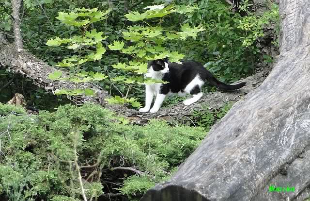 Die Katze "Strolchi", die im Flußpferdhaus wohnt, kletterte auf dem Baum. Vielleicht wollte sie Knut beim spielen zusehen.