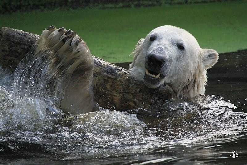 Heute früh tobte Knut den ganzen Vormittag im Wasser mit dem Baumstamm. Was für eine Ausdauer.