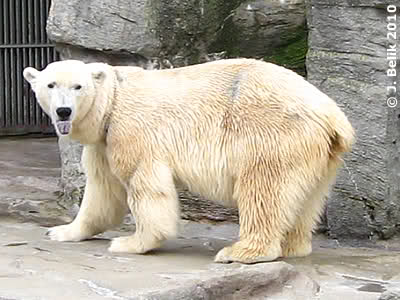 Seit der Abreise der Eisbärbuben bewohnt Tania nun die große Anlage. Auf dem Foto verspeist sie grad genüßlich einen Apfel und produziert gleichzeitg einen besonderen Saft … :-)