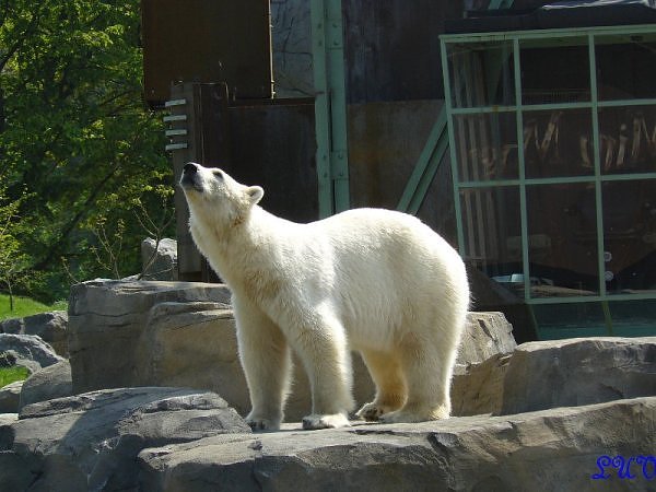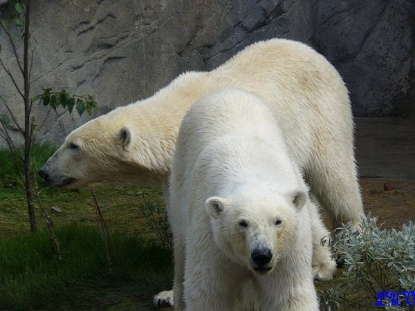 Endlich sahen wir die Eisbären. Die Anlage ist riesig. Sie ist geteilt in zwei Teile. Sprinter wohnt links, die Zwillinge wohnen auf der rechten Seite. Das Wasser ist natürlich und deswegen etwas bräunlich. Ein Generator produziert Wellen wie im Ozean. Die Bären haben eine große grüne Fläche mit kleinen Bäumen, Sträuchern und Tannen. Leider haben wir kein Spielzeug gesehen. Sprinter schlief Vormittag. Die Zwillinge liefen unruhig hin und her.