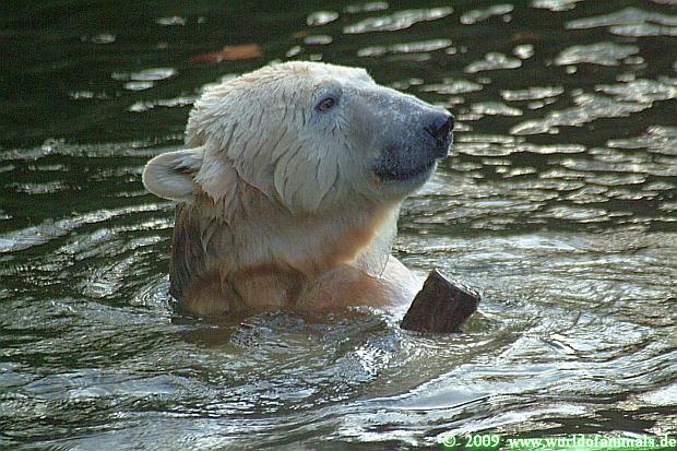 Dann kam der Höhepunkt von heute. Knut war im Wasser, und es sah aus, als hätte er ein Stöckchen zwischen den Zähnen. Wir konnten gar nicht so schnell gucken, als Gianna auf Knut zuging und ihm das vermeintliche Stöckchen aus der Schnauze nahm. Aber es war kein Stöckchen, sondern ein Fisch. Schnell raste sie damit nach oben und fraß ihn. Knut schaute genauso so verblüfft wie wir.