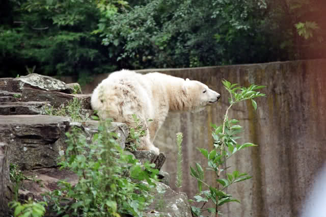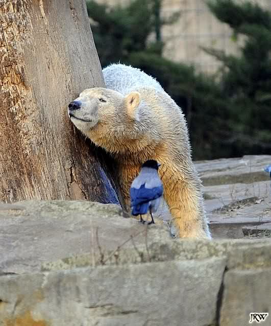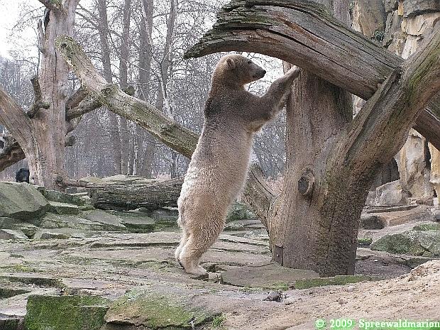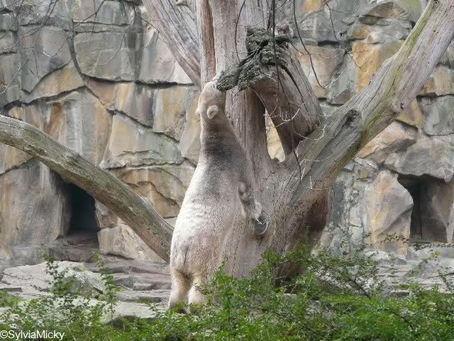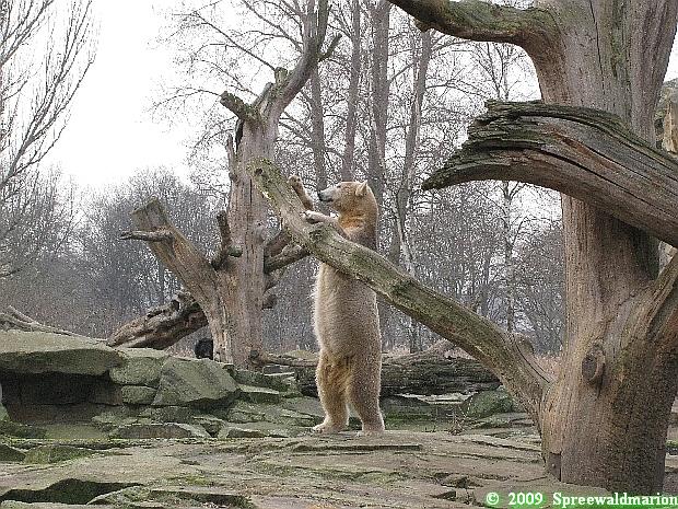 Nach der Fütterung der Eisbären ging ich zu Knut zurück. Der hatte sich wieder toll geschminkt – rechte Seite schwarz, linke Seite weiß. Ein eisbärisches Yin und Yang. Aber mit Ballspielen war nichts mehr. Knut wanderte und kletterte auf seiner Anlage herum. Er hatte inzwischen allerlei hübsche Farben angenommen und sah aus wie ein Marmorkuchen. Als er sich zum Schubbern an den Felsen stellte, hob er sich kaum vom Hintergrund ab. Dann legte Knut sich hinter dem Blechbaum zu einem wohlverdienten Nickerchen nieder.