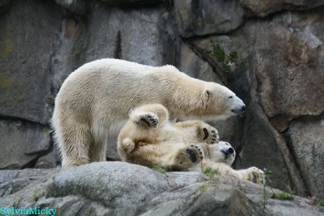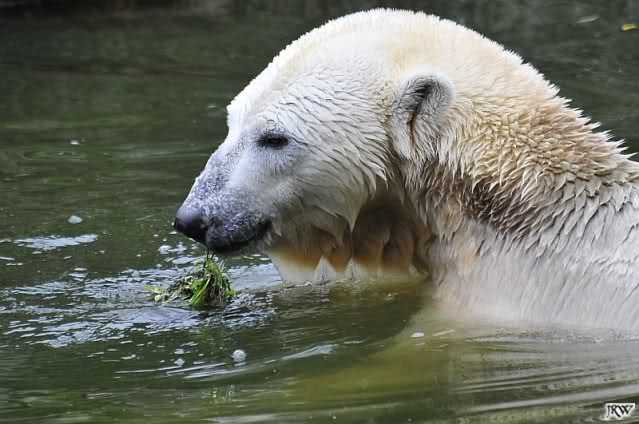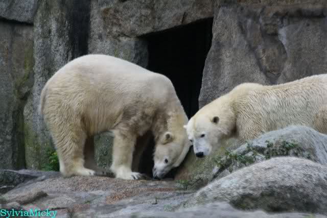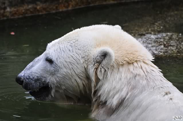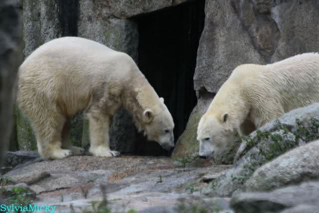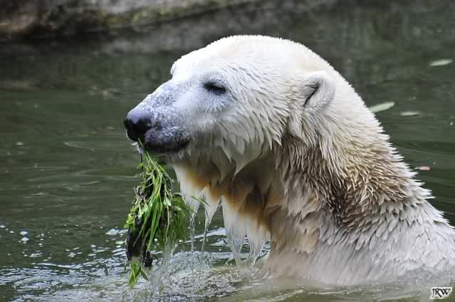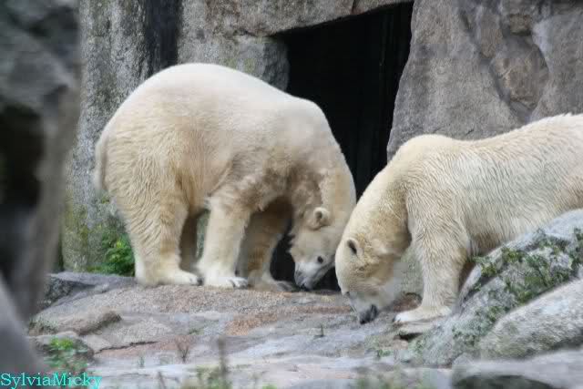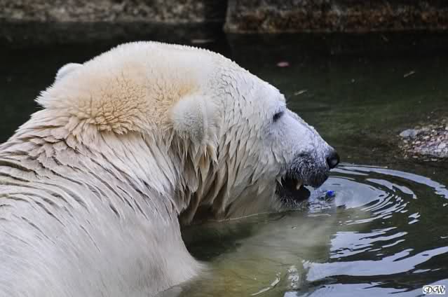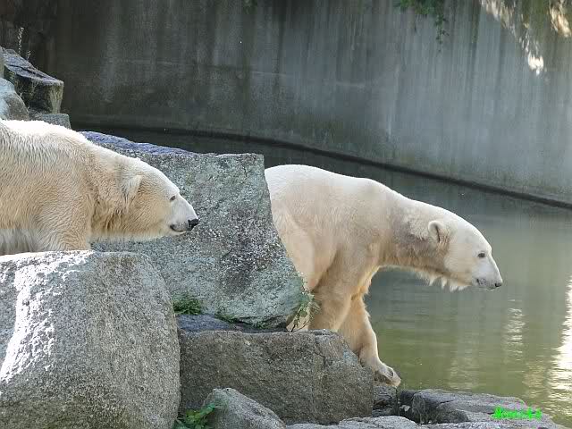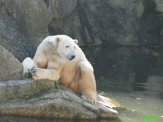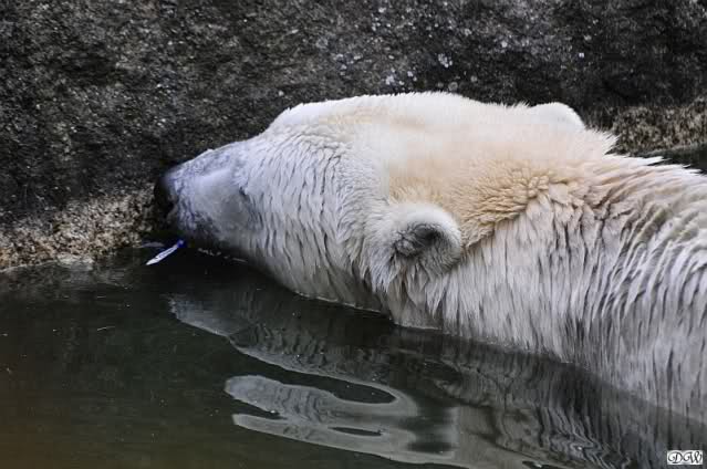 Hier sind noch einige Bilder von gestern. Es war nachmittags friedlich zwischen den Bären. Knut spielte viel im Wasser mit allem was er finden konnte. Irgendein Schwachmatiker hatte einen Kugelschreiber in das Wasserbecken geworfen und Knut spielte glücklich damit. Einige Leute fanden das sehr lustig. Auch Schwachmatiker.