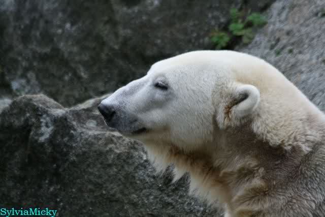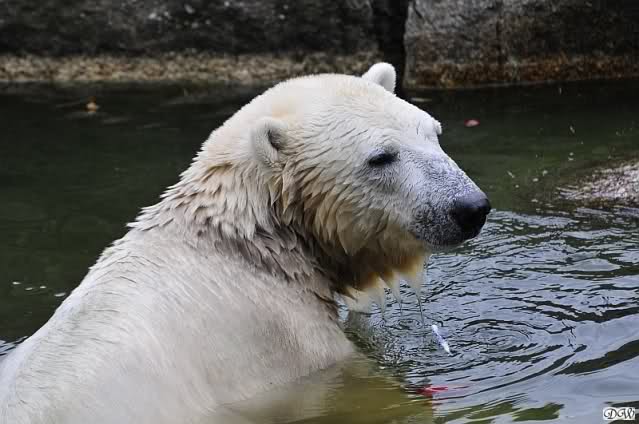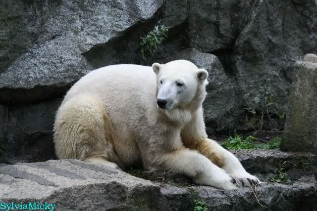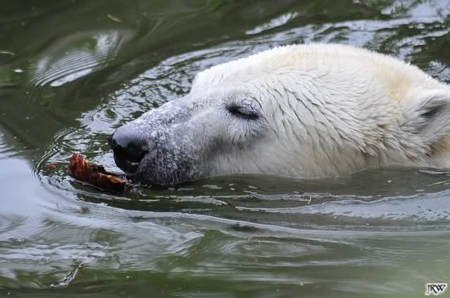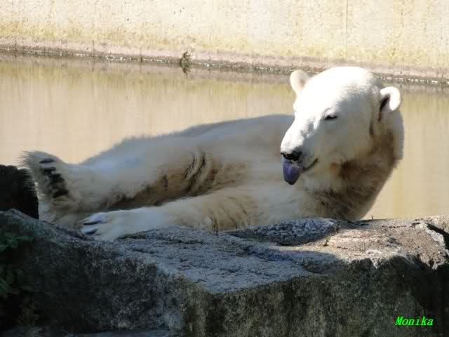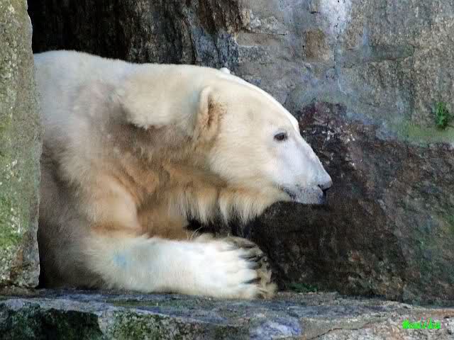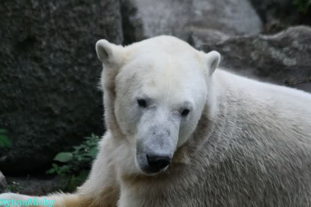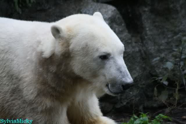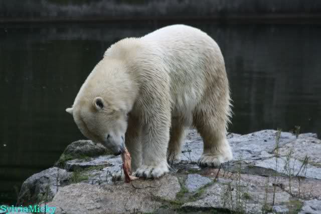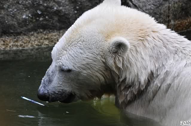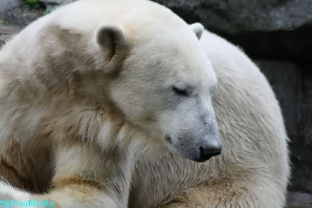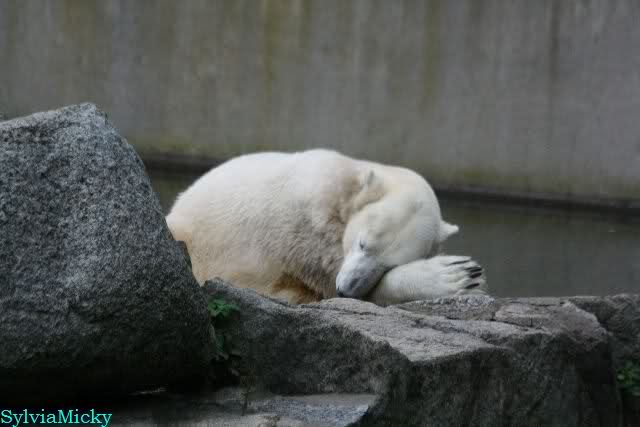 Heute früh lag Knut wieder auf dem rechten Felsen und schlief. Gefüttert hat heute Frau Weckert. Tosca war nur im Wasser und fraß und fraß.