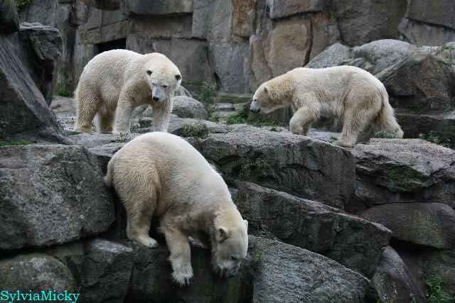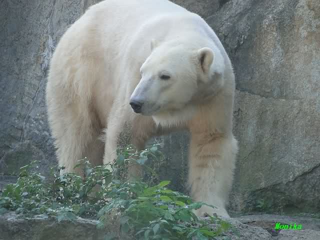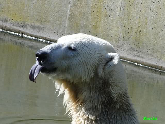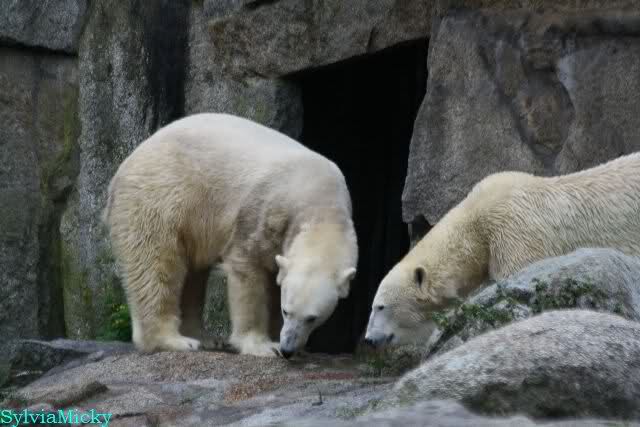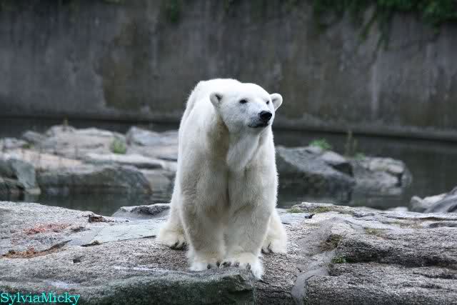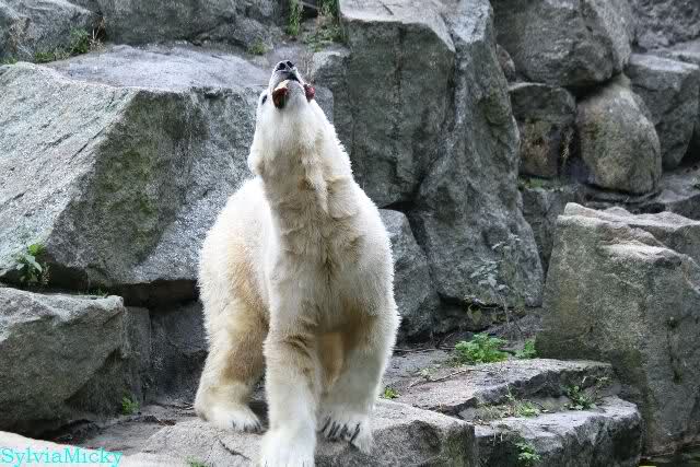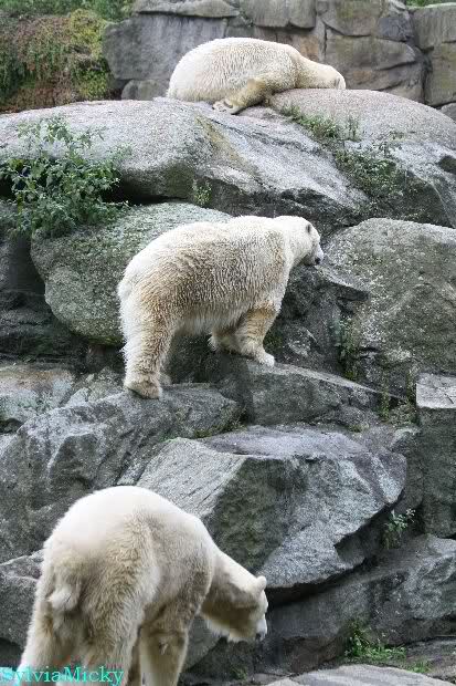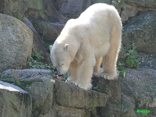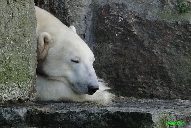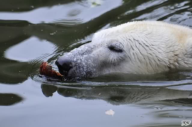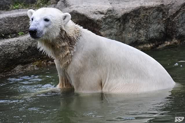 Heute früh lag Knut wieder auf dem rechten Felsen und schlief. Gefüttert hat heute Frau Weckert. Tosca war nur im Wasser und fraß und fraß.