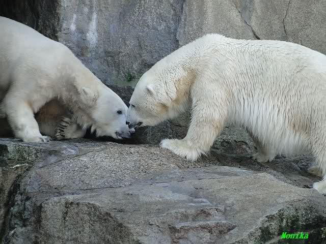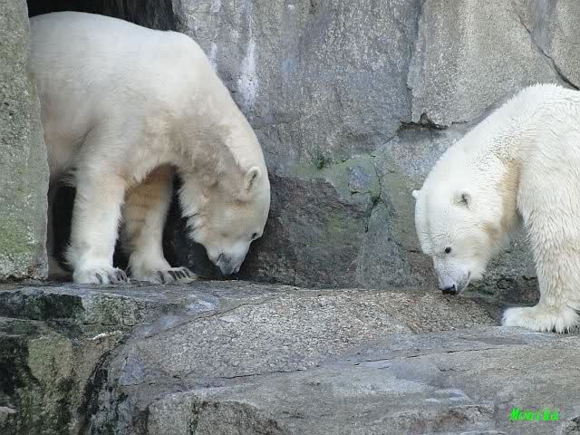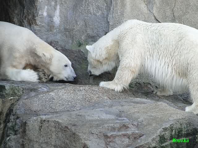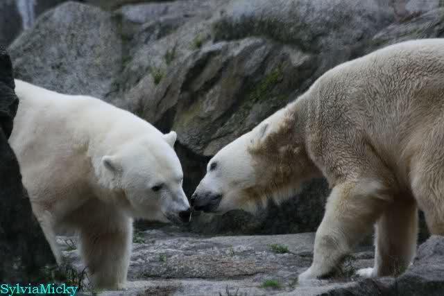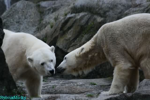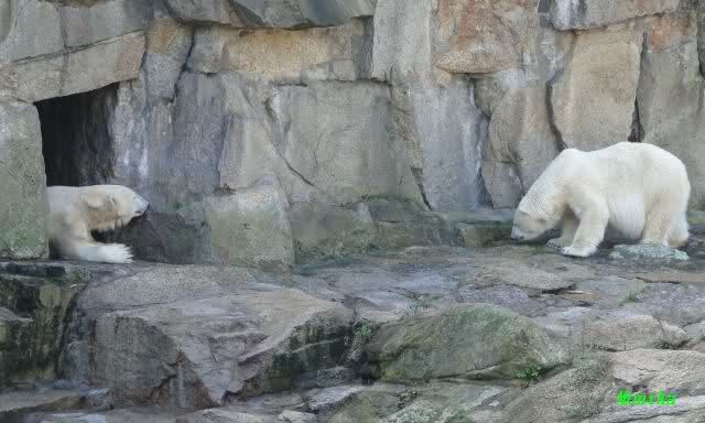 Nach der Fütterung kamen Nancy und Kati um die Ecke zu seinem Felsen. Knut ging dann auf die Anlage und stand vor Katis Höhle. Dann kam Tosca. Sie beschnupperten sich. Ohne Maul aufreißen und ohne brummen. Sie standen sich dann für eine ganze Weile völlig regungslos gegenüber. Es war faszinierend dies mit anzusehen. Knut hatte Tosca immer im Blick. Irgendwann ging Tosca weg.
