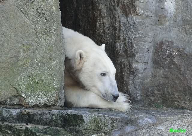 Dafür rächte sich Knut und besetzte Katjuschas Höhleneingang, in dem er den Rest des Vormittags verbrachte. Nicht kampflos, denn Kati versuchte immer wieder die Höhle zurück zu erobern. Aber unser Kleener blieb standhaft und brummte was das Zeug hält. Irgendwann gab Kati auf und überließ Knut ihren Platz. Als ich nach einen Zoorundgang wieder zurück kam, war Knut im Wasser an der Scheibe. Er saß sehr lange ziemlich ruhig im Wasser und sah immer wieder nach oben, als ob er auf Futter hoffte. Es war ja auch seine alte Fütterungszeit und satt ist er heute bestimmt auch nicht geworden. Irgendwann kam er aus dem Wasser und legte sich auf seinen Stammplatz uund schlief.